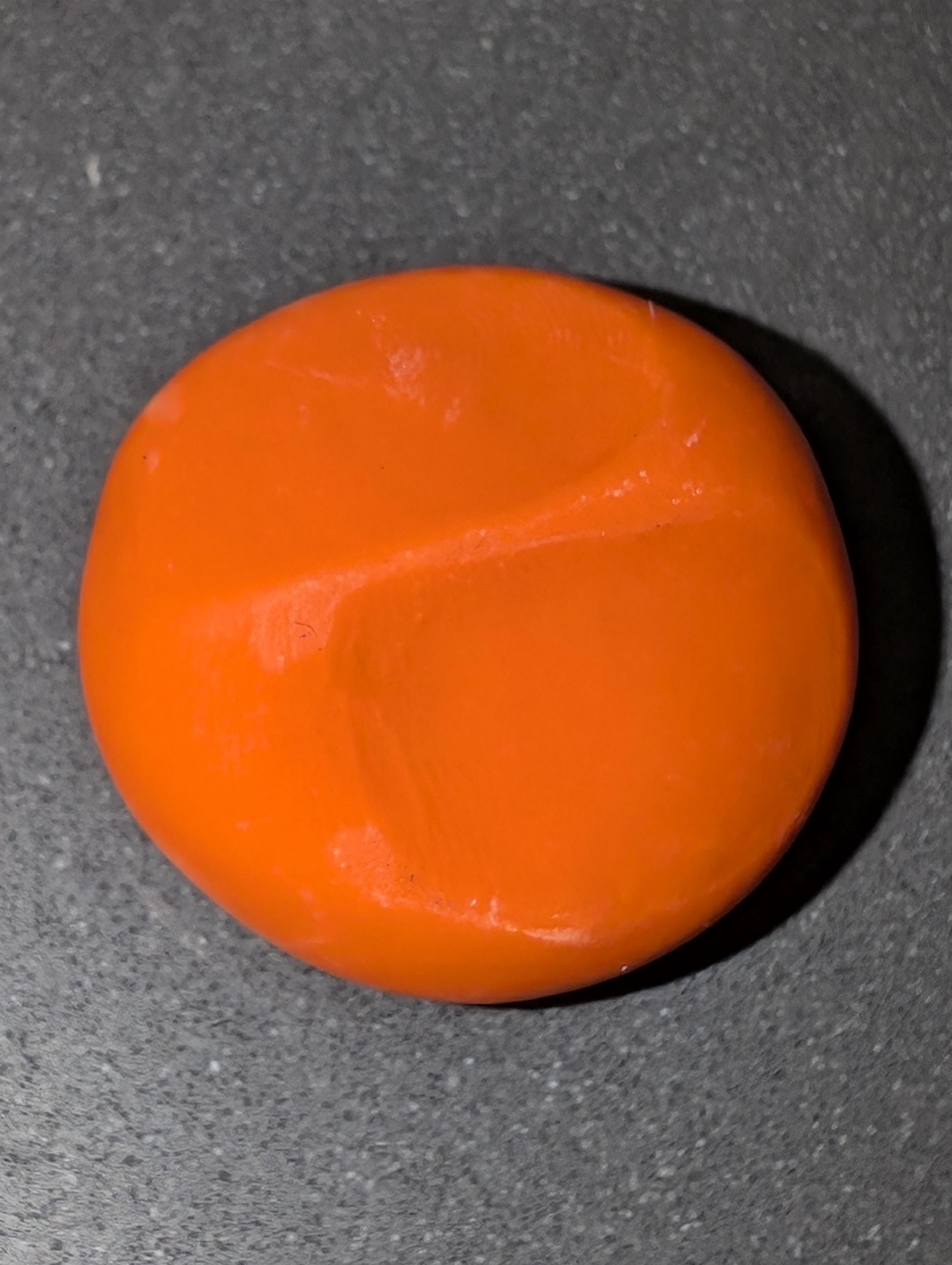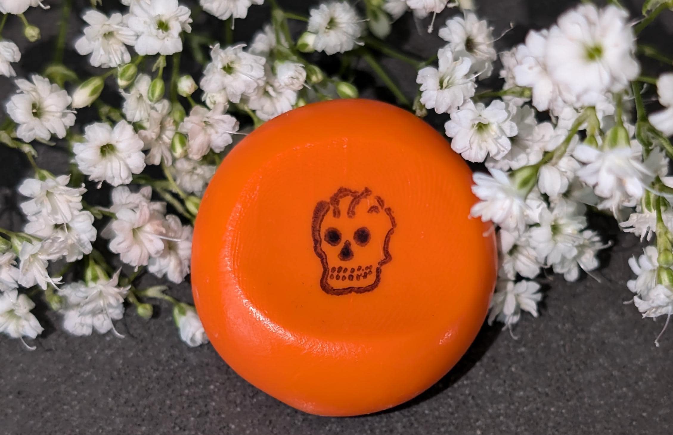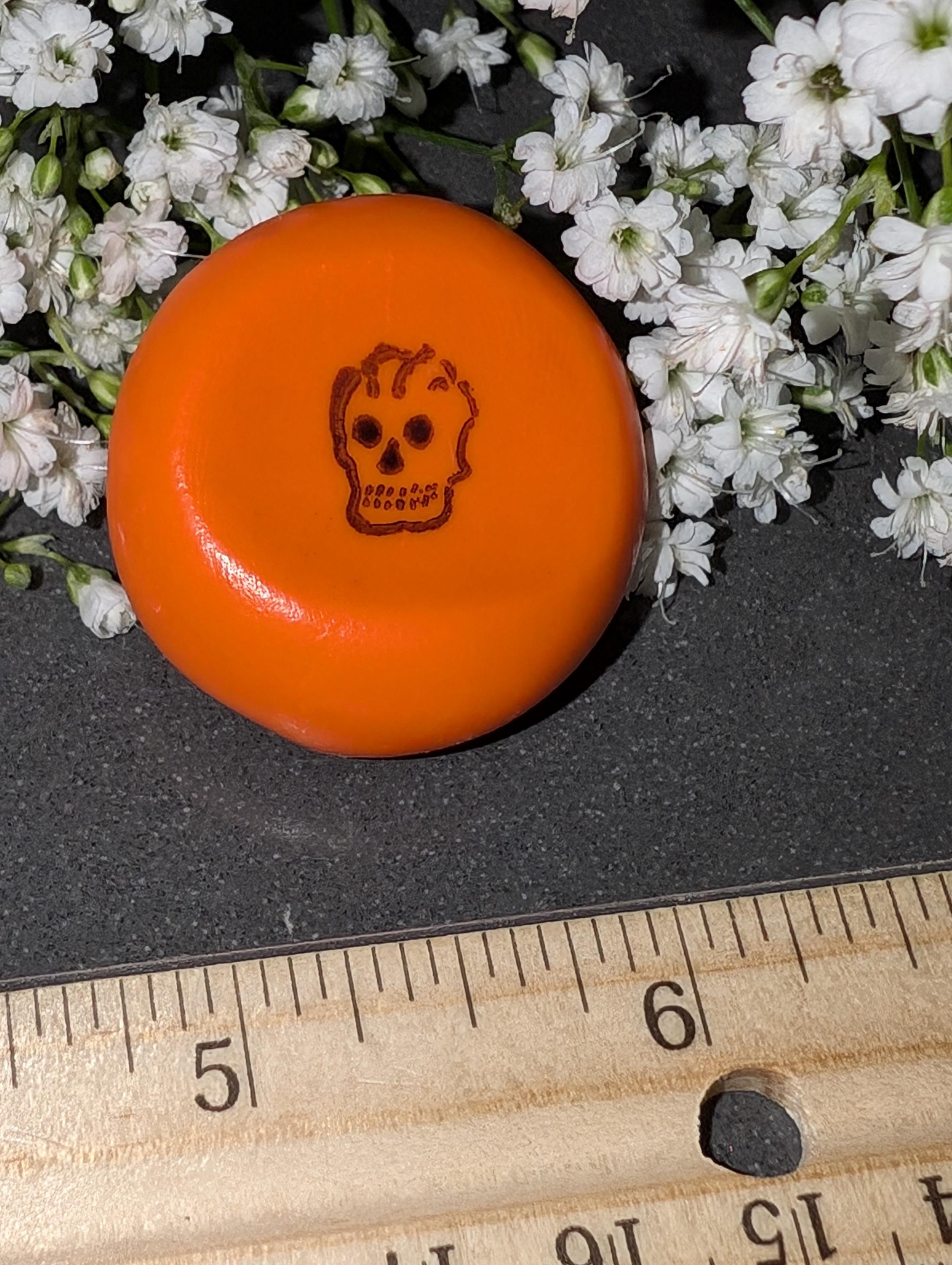 A bright orange nug with a subtle yet striking black stamp of a skeleton head and protected with a triple coat of satin finish. This unique piece embodies the essence of Halloween while also celebrating the vibrant traditions of the Day of the Dead. It serves as a thoughtful tool for mindfulness for kids, promoting intentional reflection on life and death. Positioned for right-hand orientation, it comfortably fits in the palm, making it an ideal companion to honor those that have passed. This discreet fidget can easily slip into a pocket, offering a calming presence throughout the day.