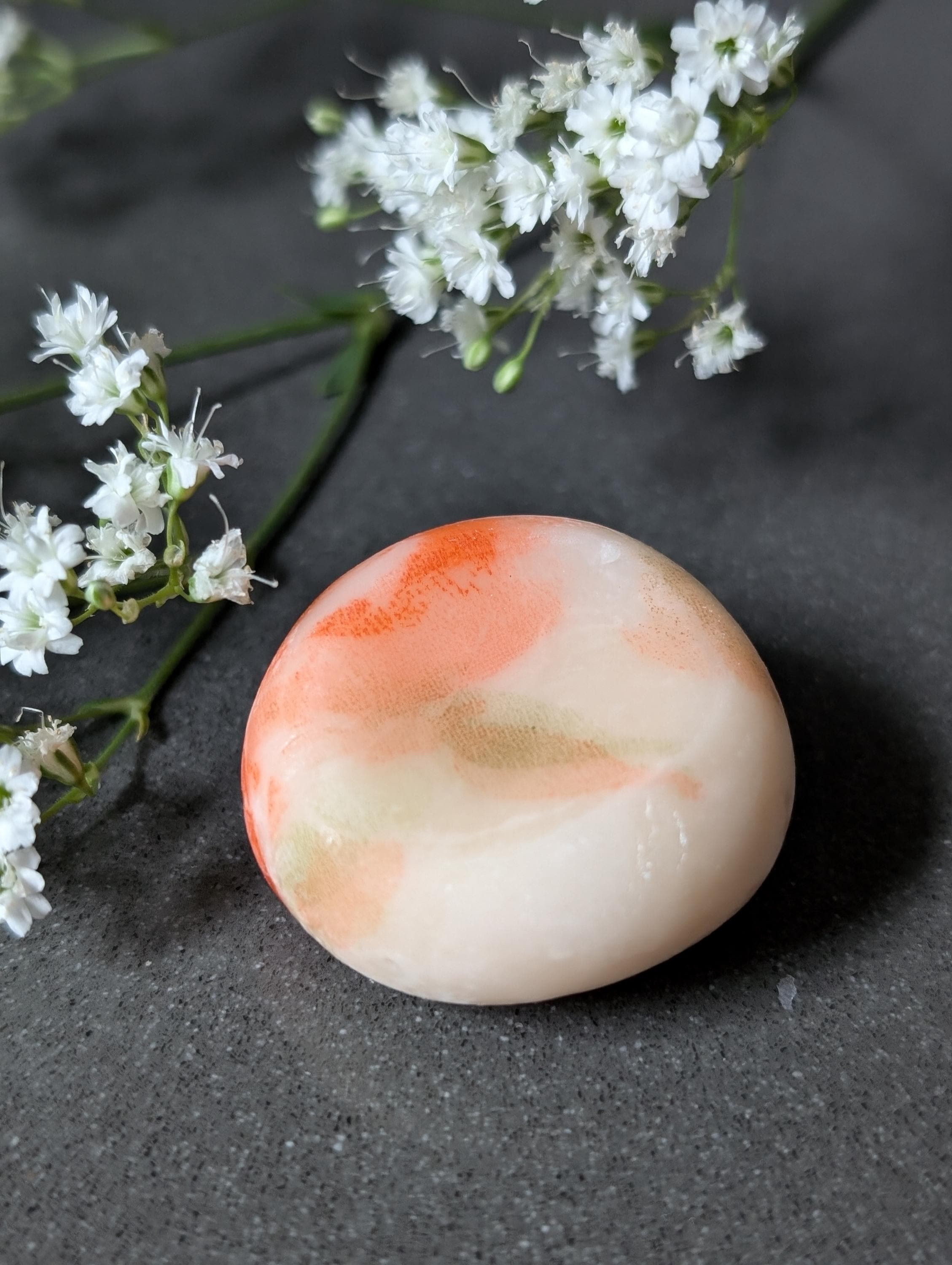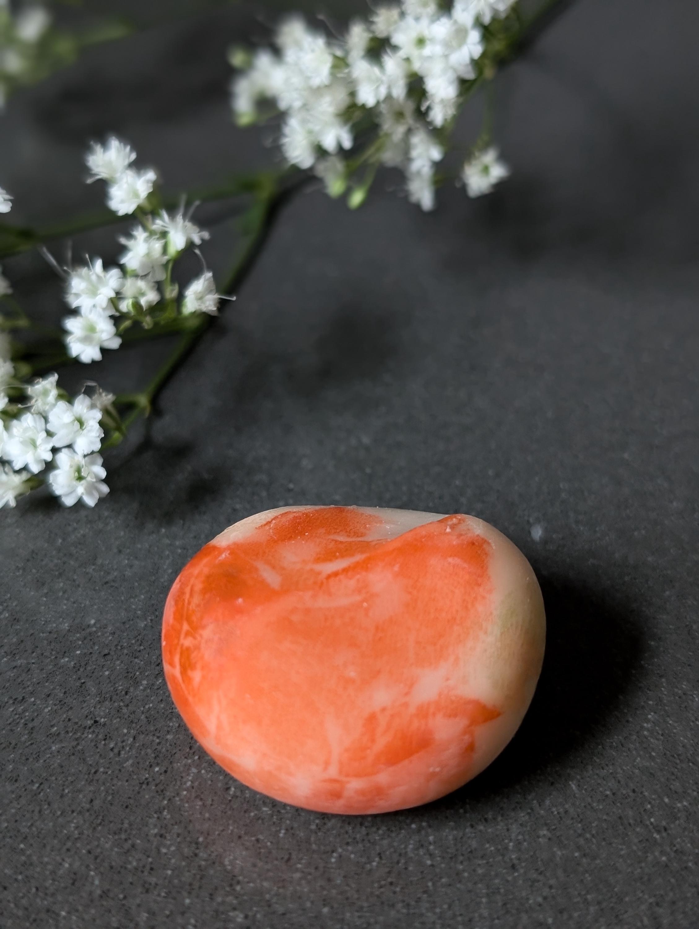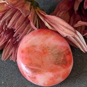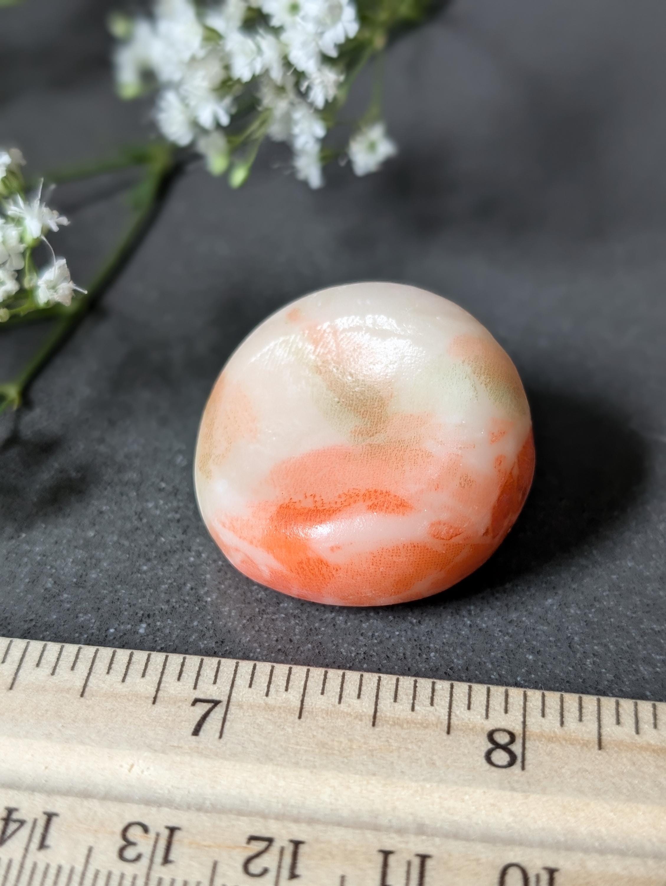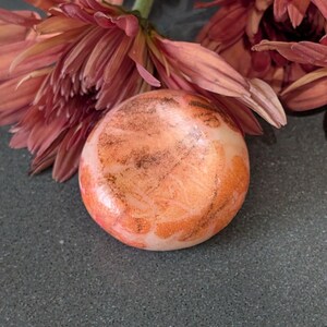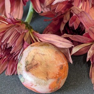This remarkable nug features an exquisite translucent polymer clay that showcases a careful ink transfer technique, resulting in a dream-like botanical rendering on the top surface that invites contemplation and connection to nature. This beautiful and intricate design seamlessly bleeds into a vibrant orange hue on the reverse side, creating a stunning visual contrast that captivates the eye and uplifts the spirit. Specifically designed for left-hand orientation, the piece is finished with a meticulous triple coat of satin, enhancing its elegant appearance while providing a smooth, tactile experience enriched with subtle variations, including rough textures reminiscent of the beauty found in nature.