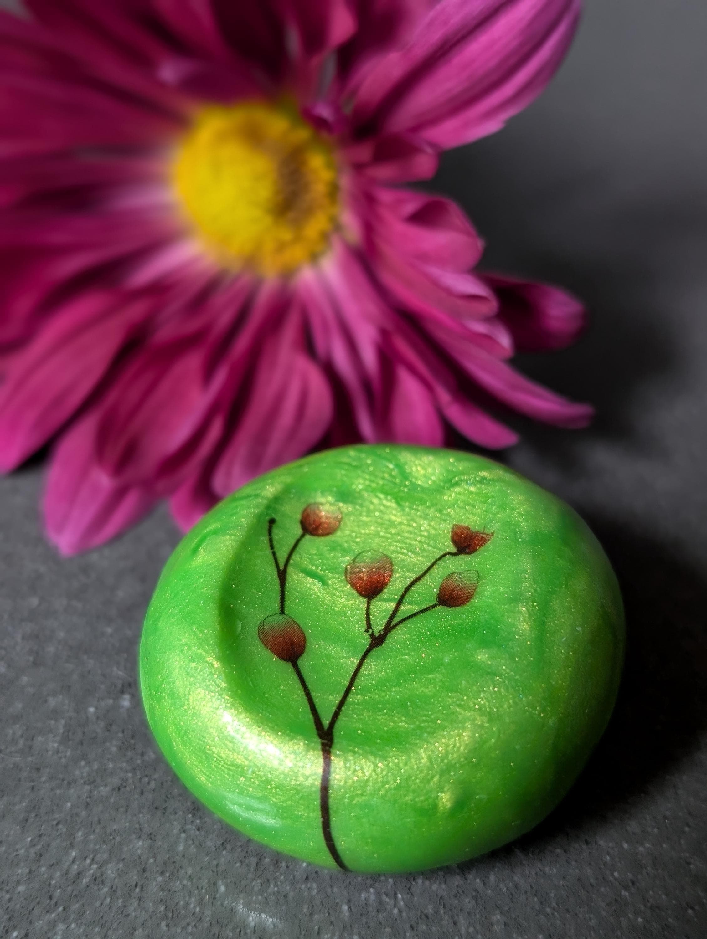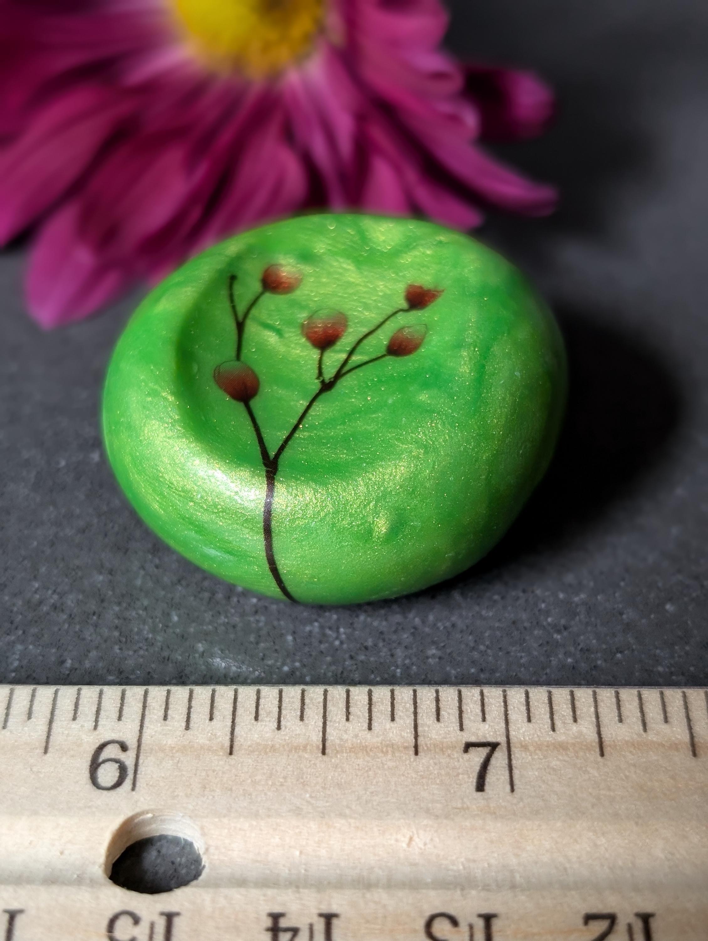 The exquisite green pearl nug elegantly hosts delicate blooms that gracefully outstretch across its surface, complemented by a trailing stem on the reverse side. A triple coat of satin provides an added layer of protection, ensuring its beauty remains intact. Designed for right-hand orientation, this piece boasts subtle variations in texture, thoughtfully crafted to mimic the natural patterns found in the world around us.