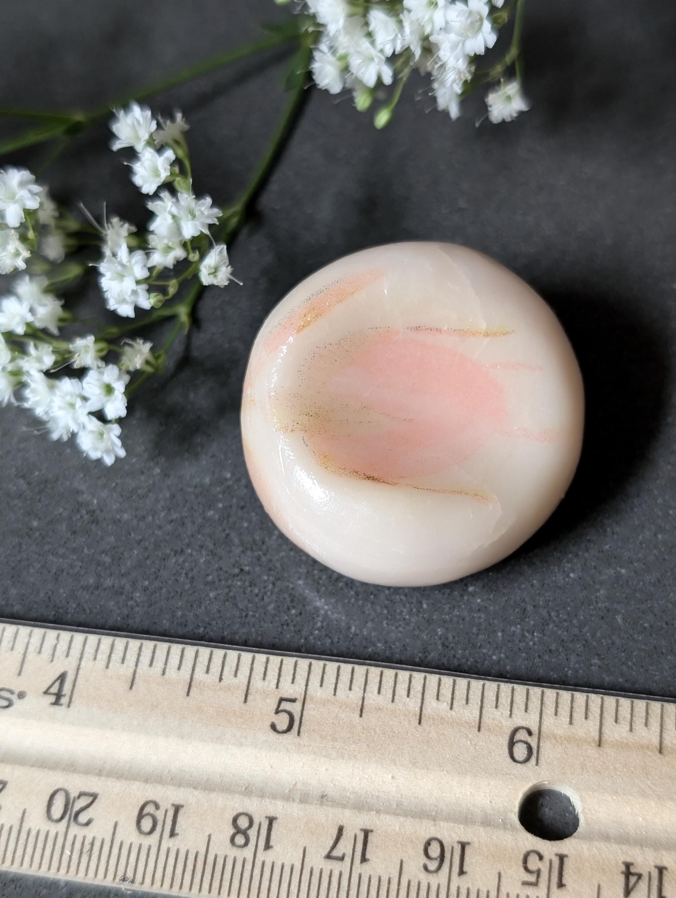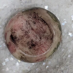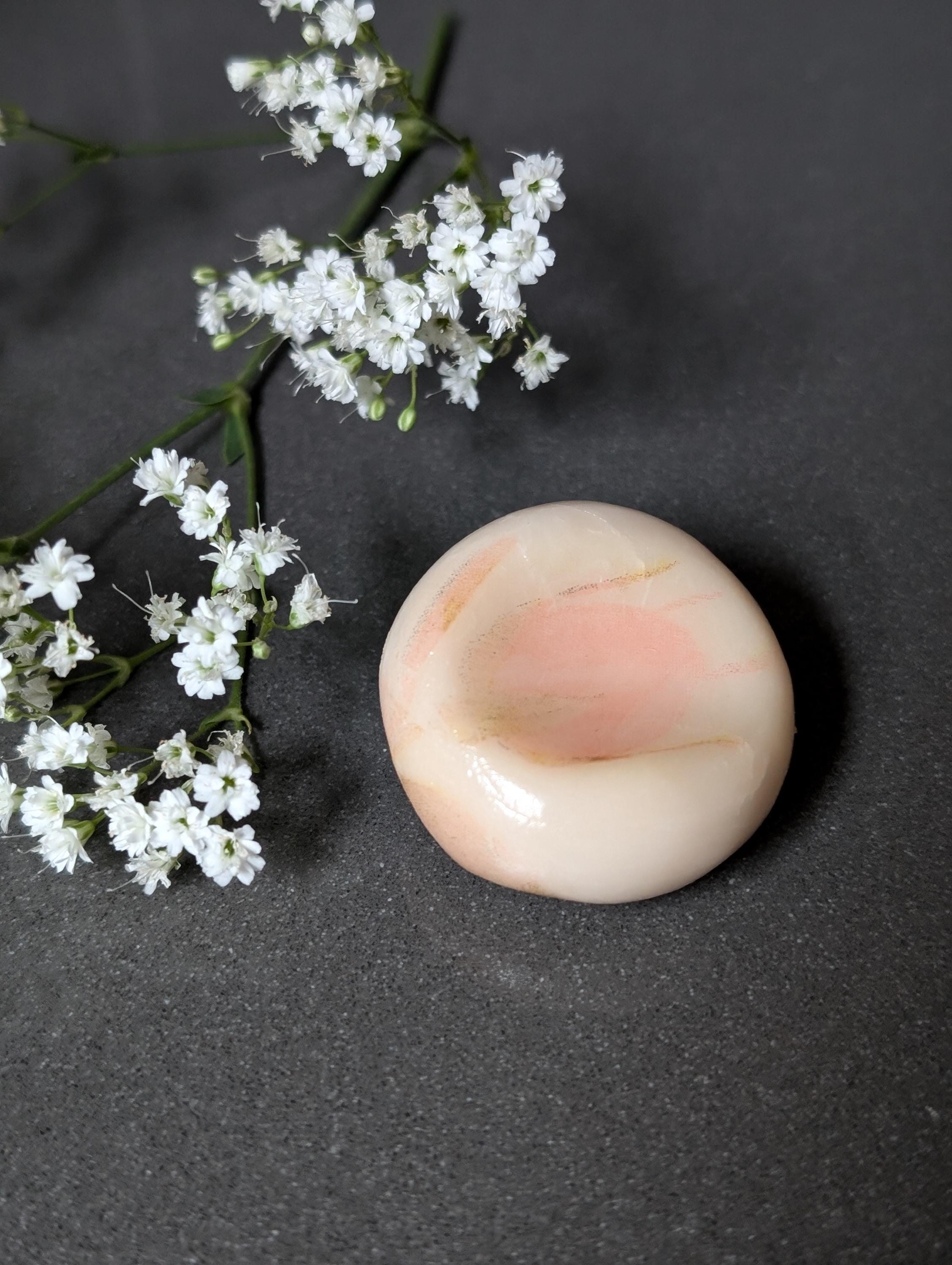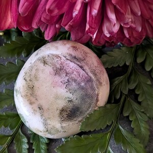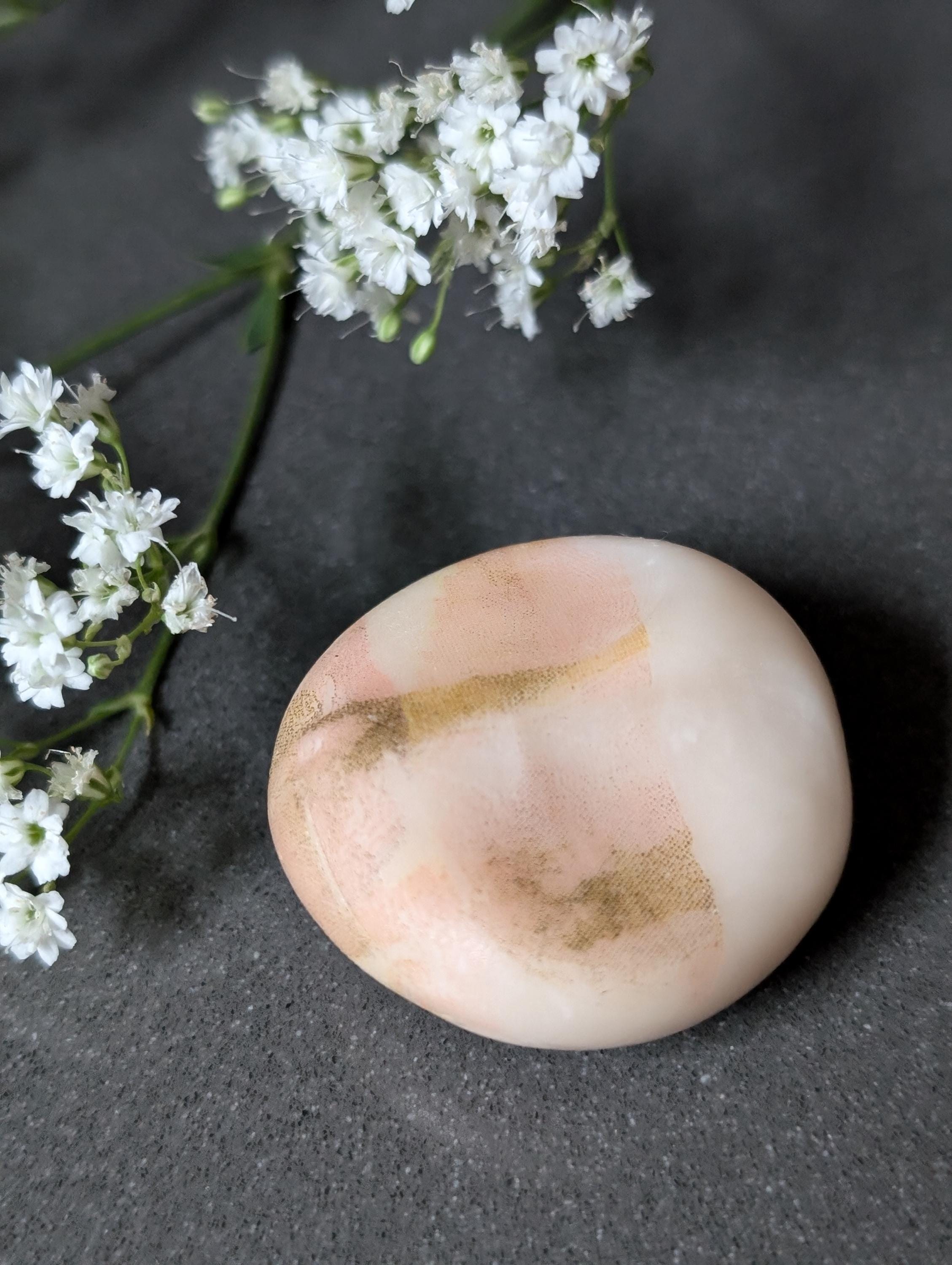 The small batch of the Into The Garden collection gracefully drops as we find ourselves at the serene conclusion of the vibrant summer season. As we intentionally transition into this new phase, we start to keenly observe the relentless rushing of time that surrounds us, a phenomenon that is particularly highlighted by local retailers and their eager anticipation to showcase enticing items for the much-anticipated upcoming fall and winter holidays. In this tranquil moment of stillness, let us consciously take a step back and fully be present, wholeheartedly embracing and remaining mindful of the beautiful nuances that envelop us right now in the lingering warmth of late summer. This exquisite translucent nug features a subtle and soft rendering of a delicate rose by way of an intricate ink transfer, which has been lovingly protected by a triple satin coat to ensure its enduring beauty. With a right-hand orientation, this piece showcases a subtle, rough texture reminiscent of nature's imperfect charm.