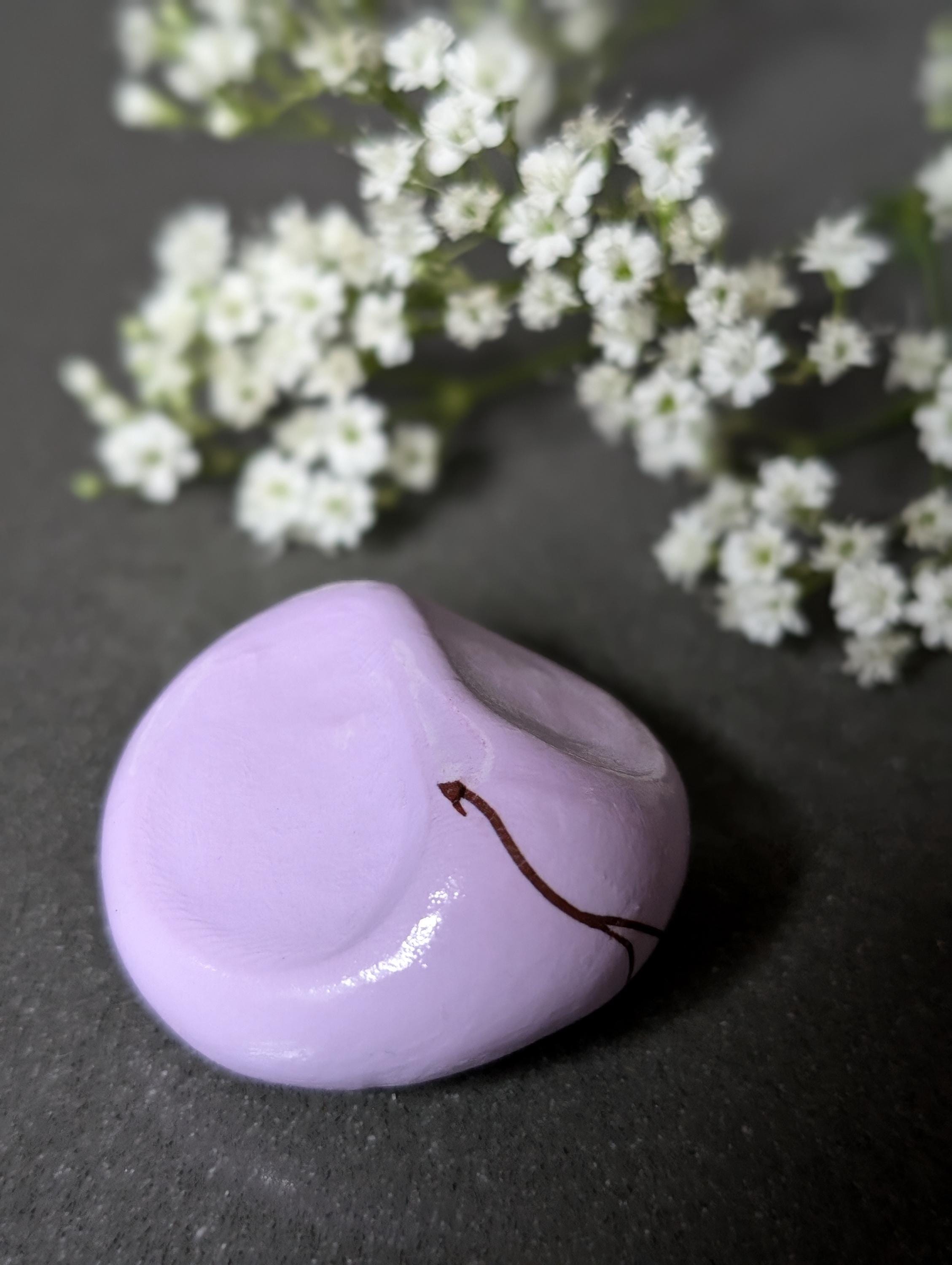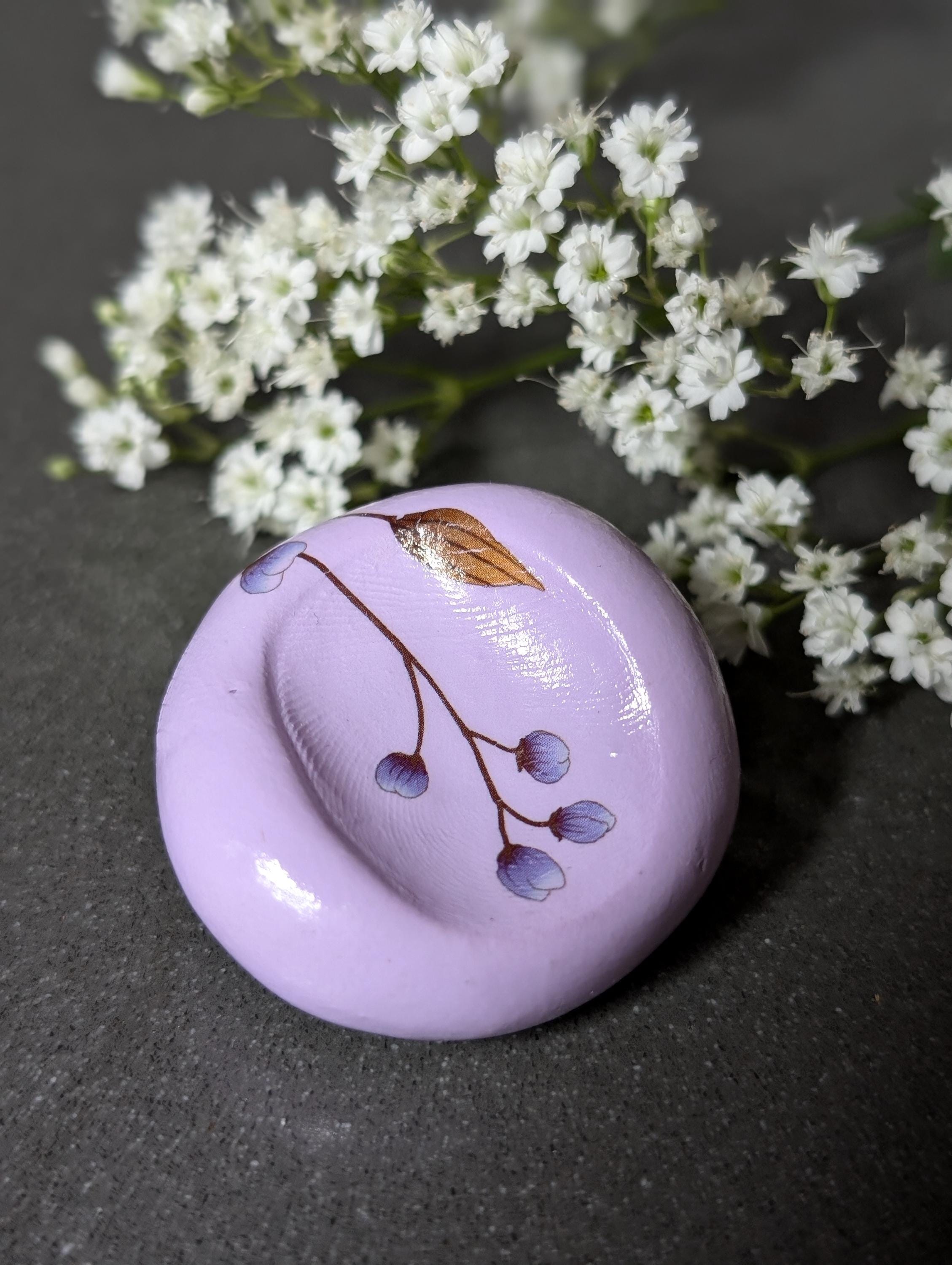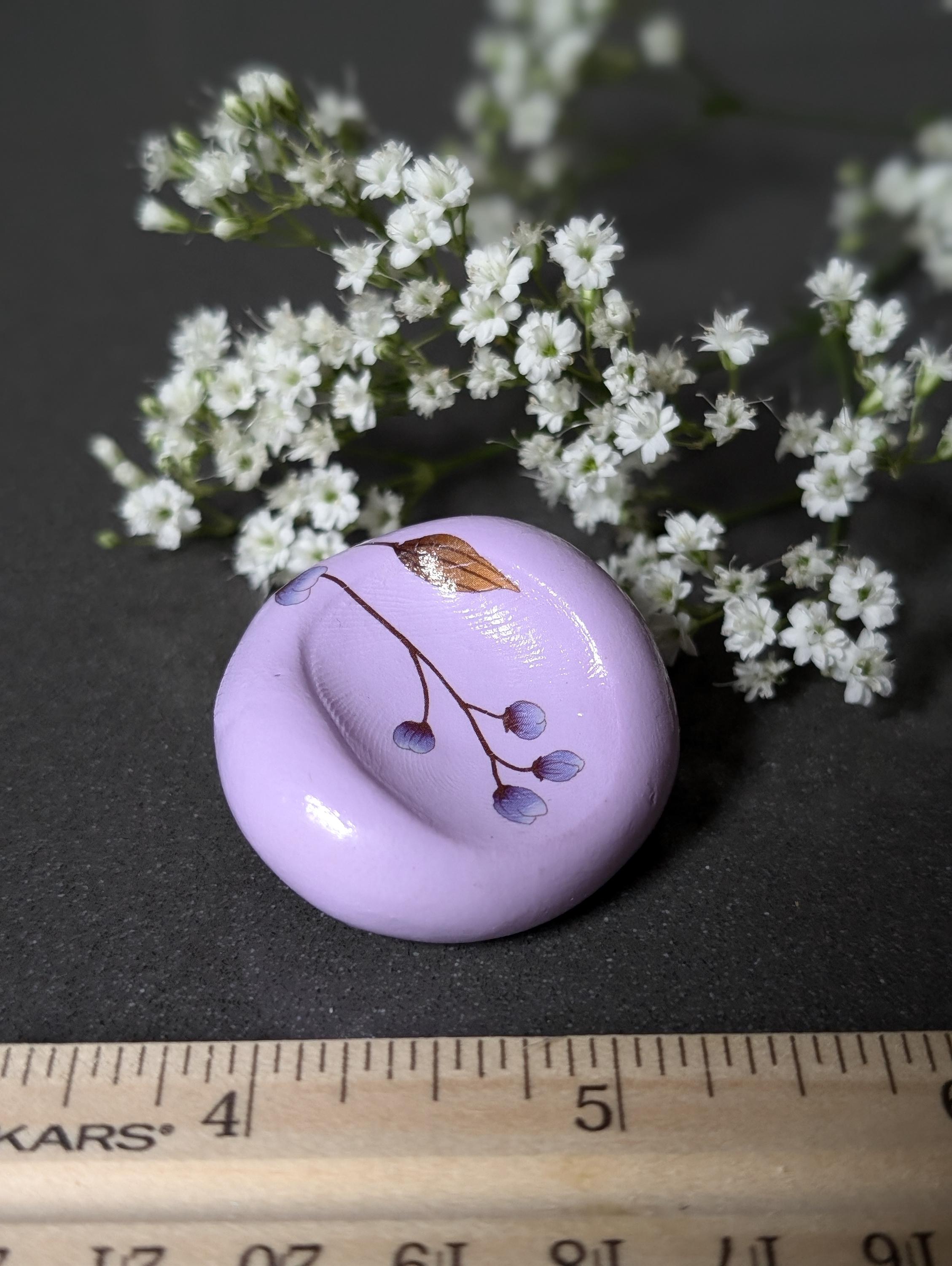 The lavender nug featuring a delicate, enchanting purple flower stem, gracefully outstretched and trailing elegantly to the reverse side. This thoughtfully designed piece is created with a right-hand orientation for ease of use and a deeper connection during your meditative practices. The nug creates subtle variations in texture, mirroring the gentle imperfections found in nature. Finished with three meticulously applied coats of satin for enhanced protection, ensuring its exquisite beauty lasts for years to come while providing a lasting presence in your mindfulness journey.