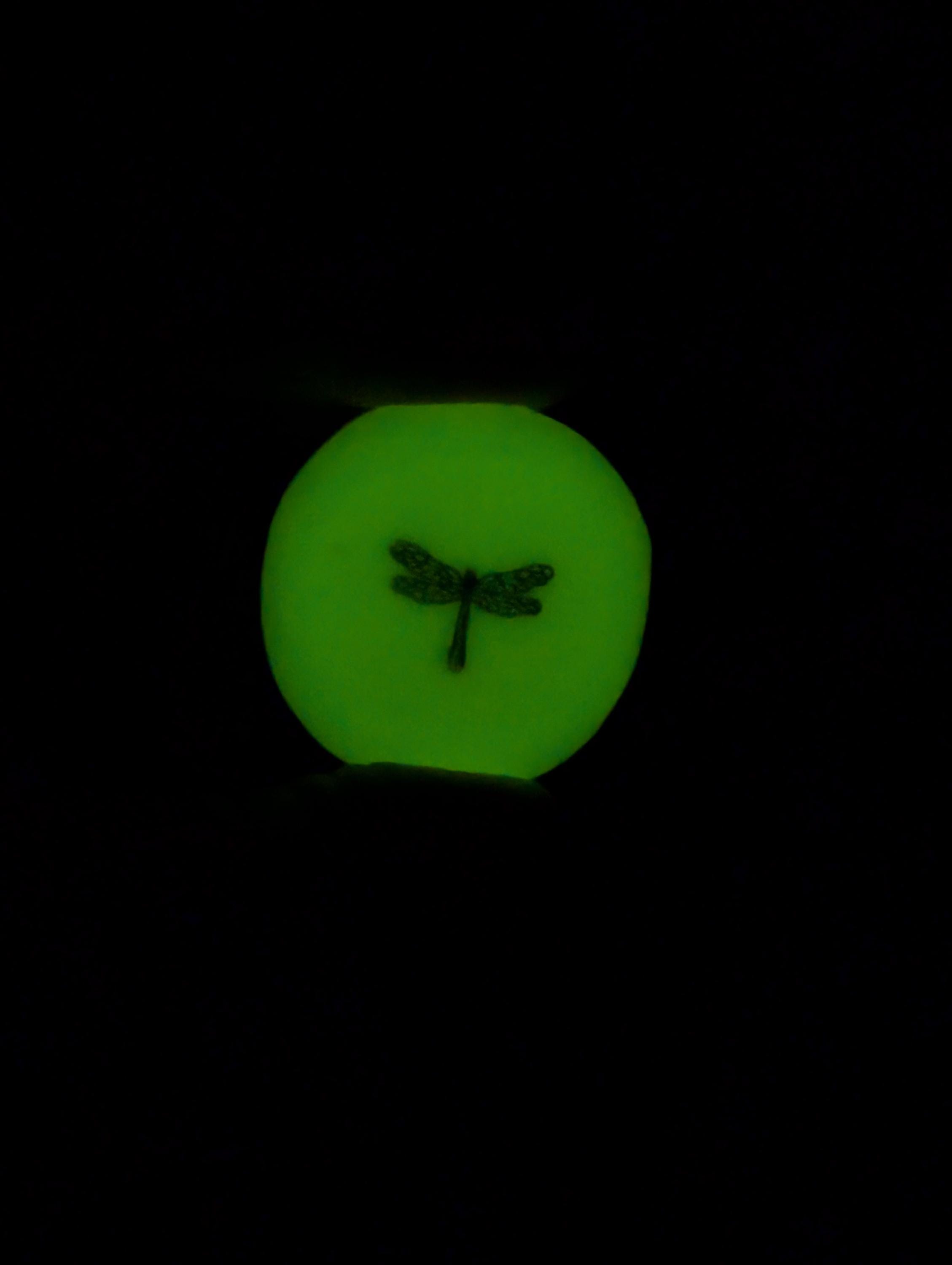 Glow in the dark nug featuring an intricate dragonfly delicately stamped on its surface, beautifully coated with three luxurious coats of satin finish for a smooth touch. Designed with right-hand orientation, this unique piece not only serves as a tangible reminder of your practice but also embodies the rich lore of the dragonfly, guiding and accompanying you on your personal journey to stillness and mindfulness.right-hand orientation, making it a perfect nighttime companion that supports tranquil moments of rest and wonder.