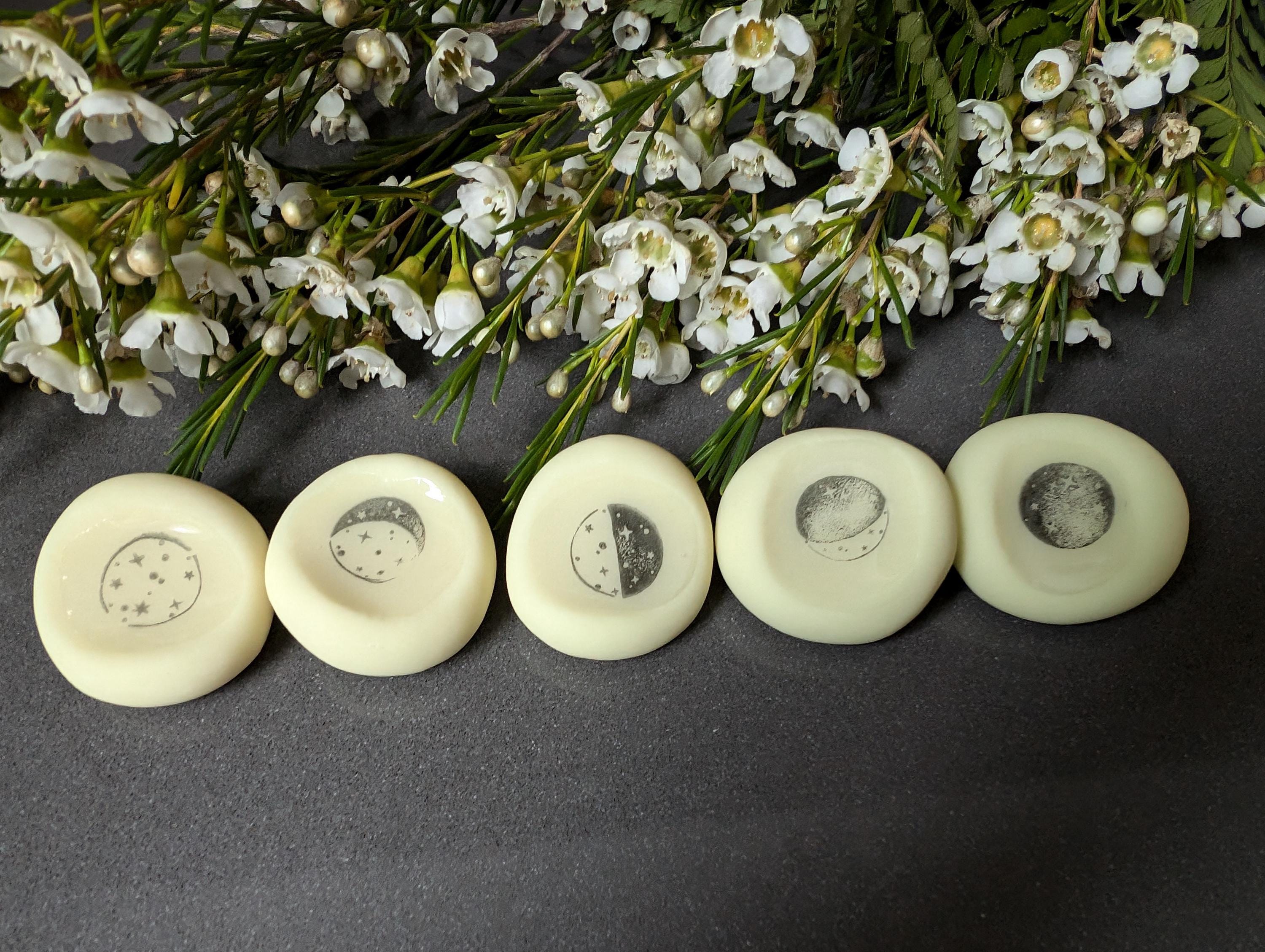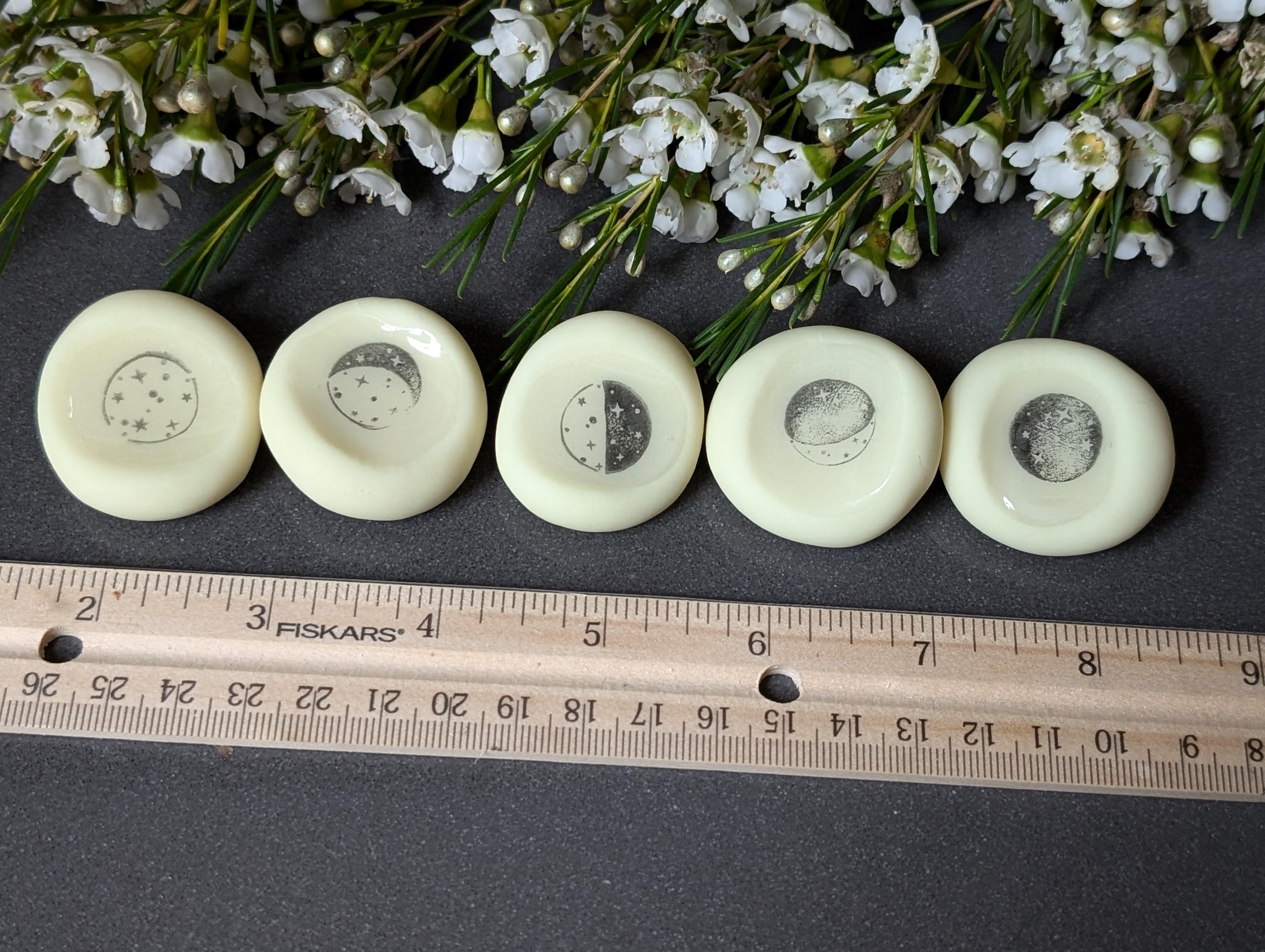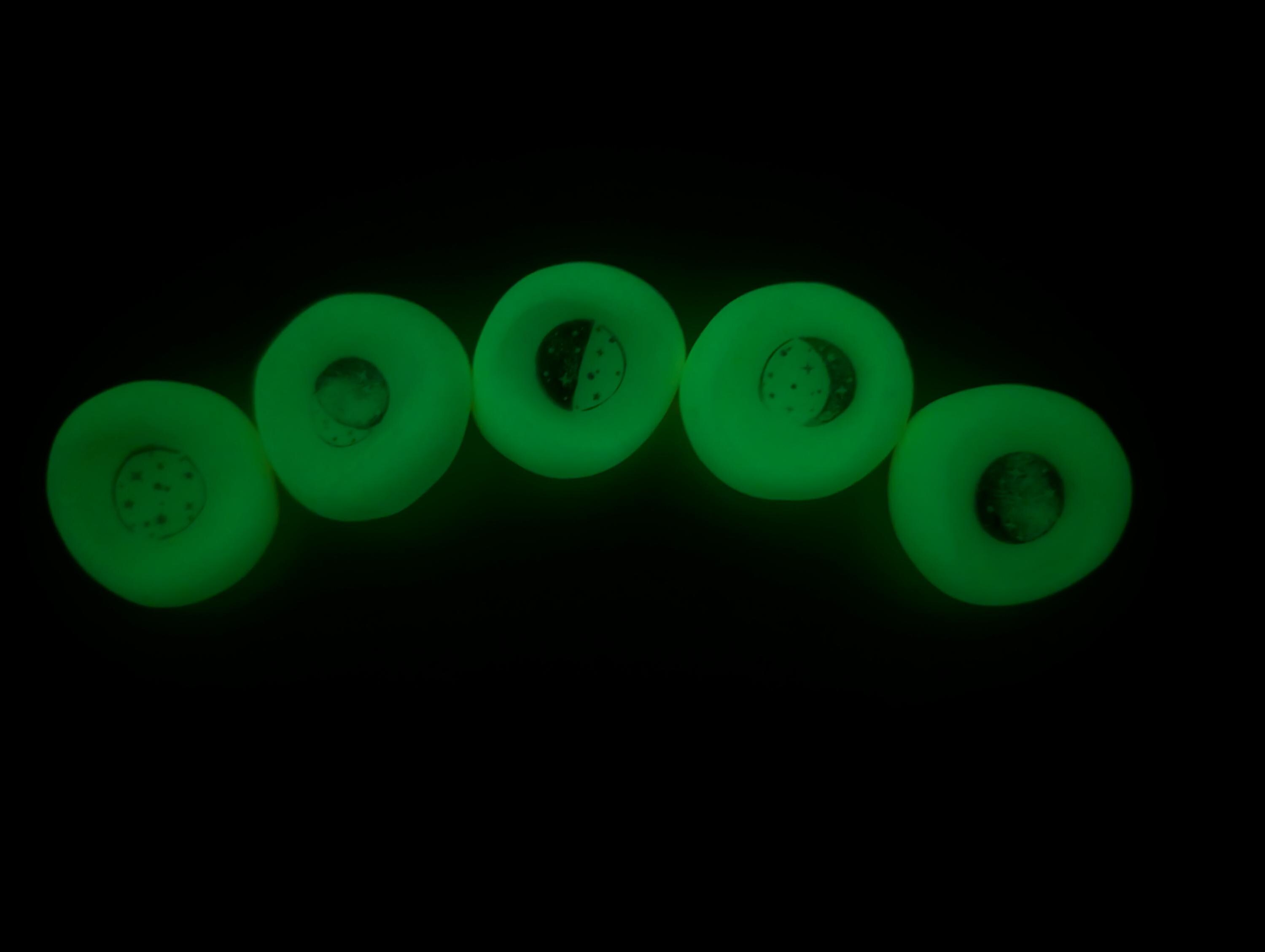 This thoughtfully curated set of five nugs artfully showcases five distinct and mesmerizing phases of the moon that are visible both in light and dark as they glow impressively in the dark. Each nug embodies her profound feminine energy and unique qualities, offering an invitation to connect with the sacred cycles of nature. Designed specifically for right-hand orientation, these exquisite pieces are further enhanced with a high-quality stamp and a glossy resin finish, beautifully capturing the essence of lunar symbolism and allowing them to radiate with timeless elegance. Lunar symbolism represents the ever-changing cycles of change, renewal, and the rhythmic ebb and flow of life, reflecting the emotional depth and intuitive wisdom often associated with the nurturing feminine spirit. Embrace the deeper meanings of the moon, and allow these nugs to gracefully guide your transformative journey towards mindfulness, introspection, and a profound connection within yourself.