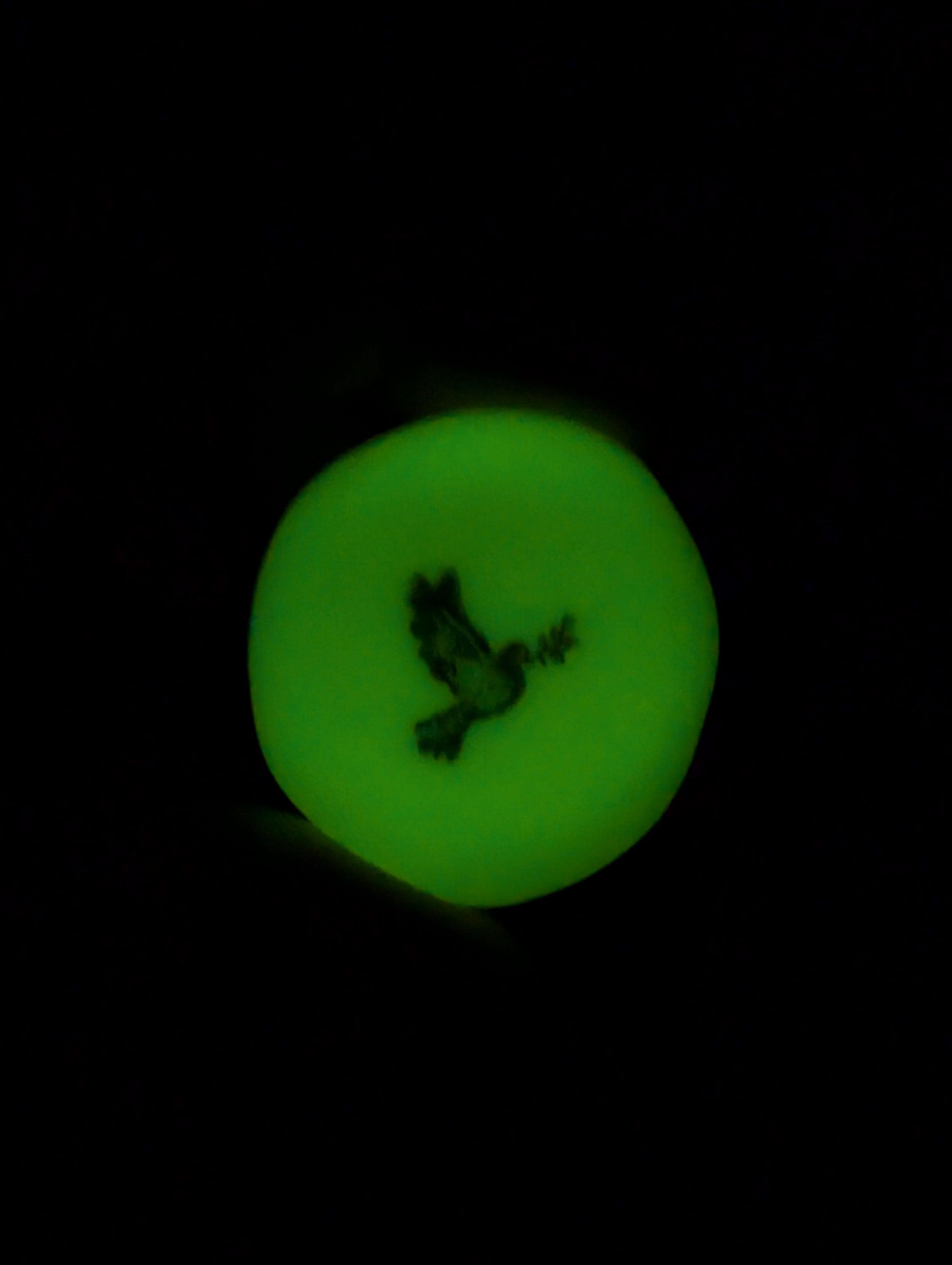 A beautifully crafted dove, gently grasping an olive branch that symbolizes peace, elegantly adorns this unique glow-in-the-dark nug. Designed for right-hand orientation, it features three meticulous coats of satin glaze, ensuring a smooth and radiant finish that enhances its meditative presence.