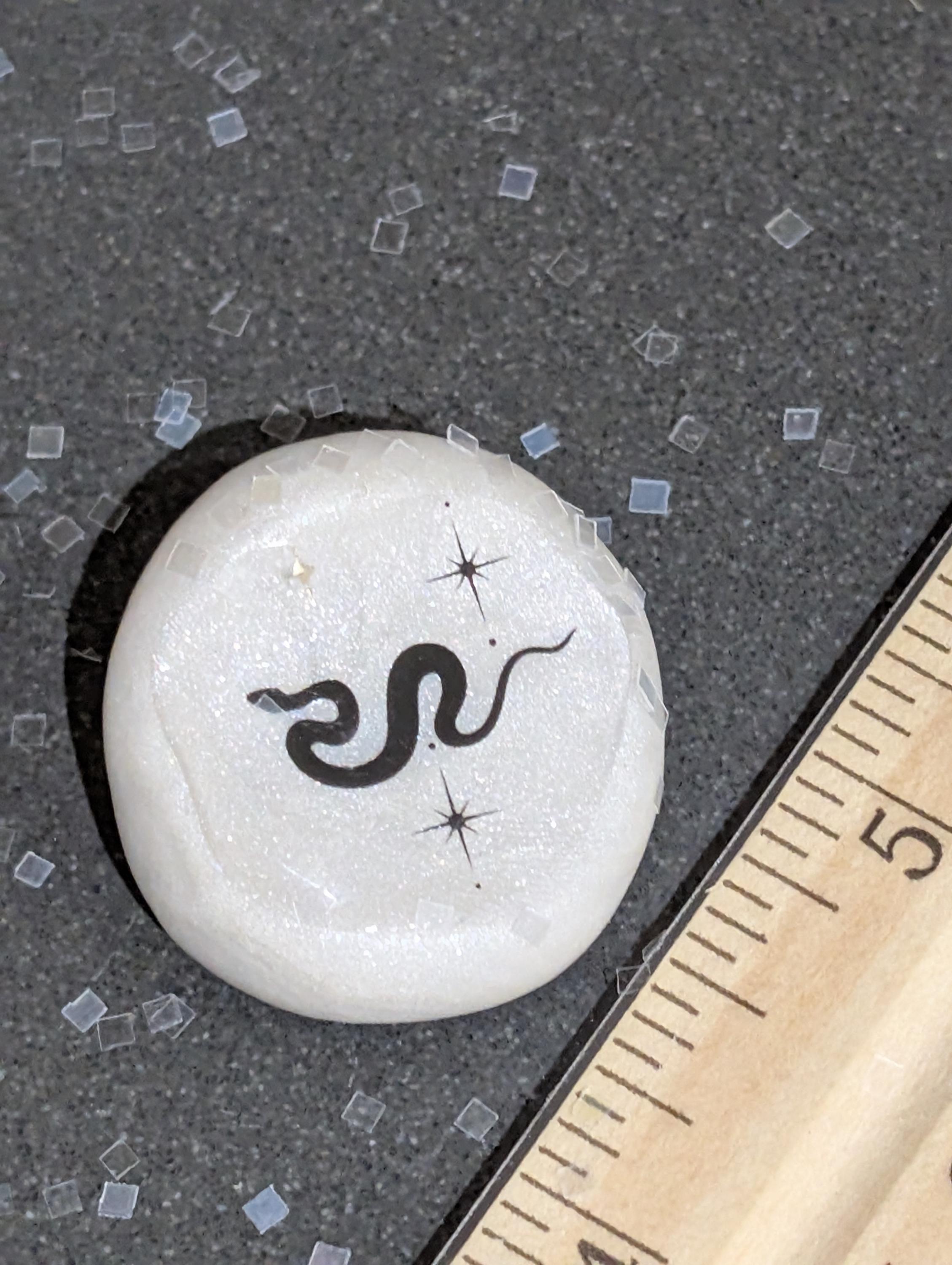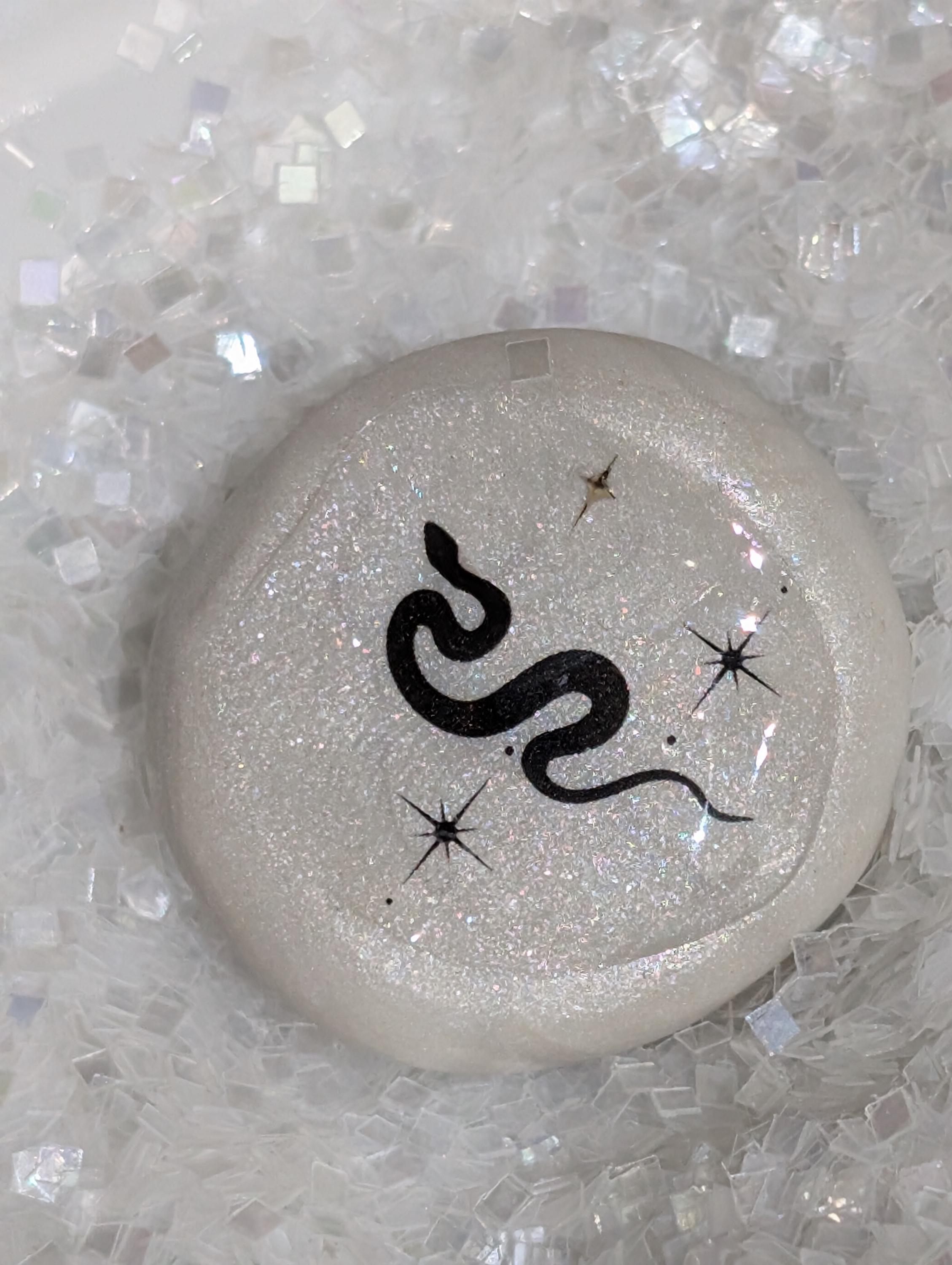 A dainty, black snake gracefully slithers across the reflective, pearl-colored nug. This enchanting piece features a right-hand orientation and is meticulously resin-coated, making it both durable and visually appealing. It is thoughtfully designed to fit comfortably in small children's fingers, encouraging exploration and play. This intentional creation invites mindfulness of all the wondrous creatures that inhabit our world, reminding us of the interconnectedness of nature.