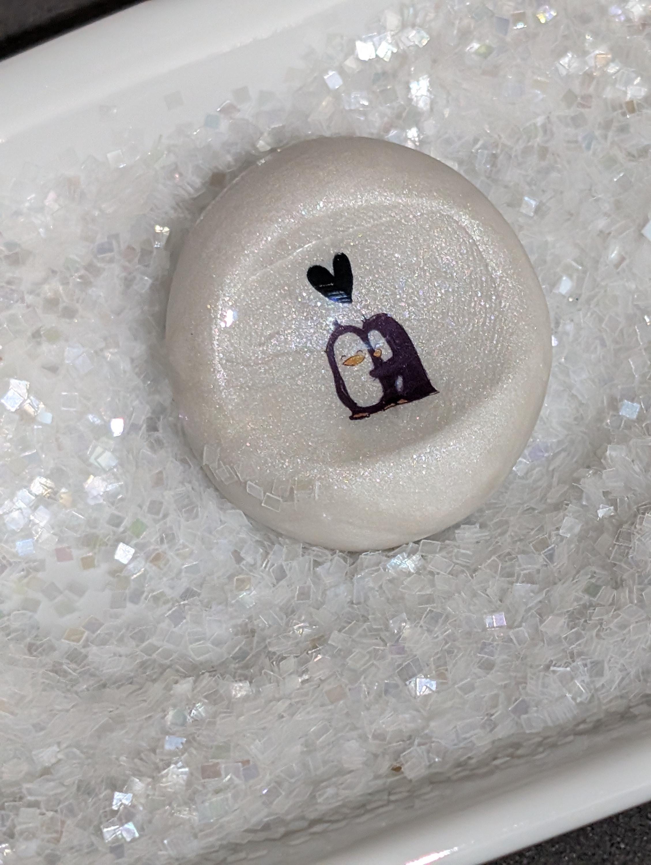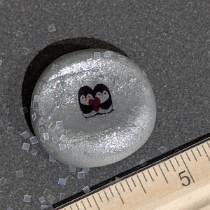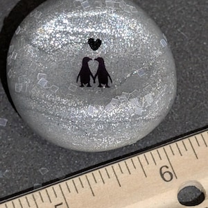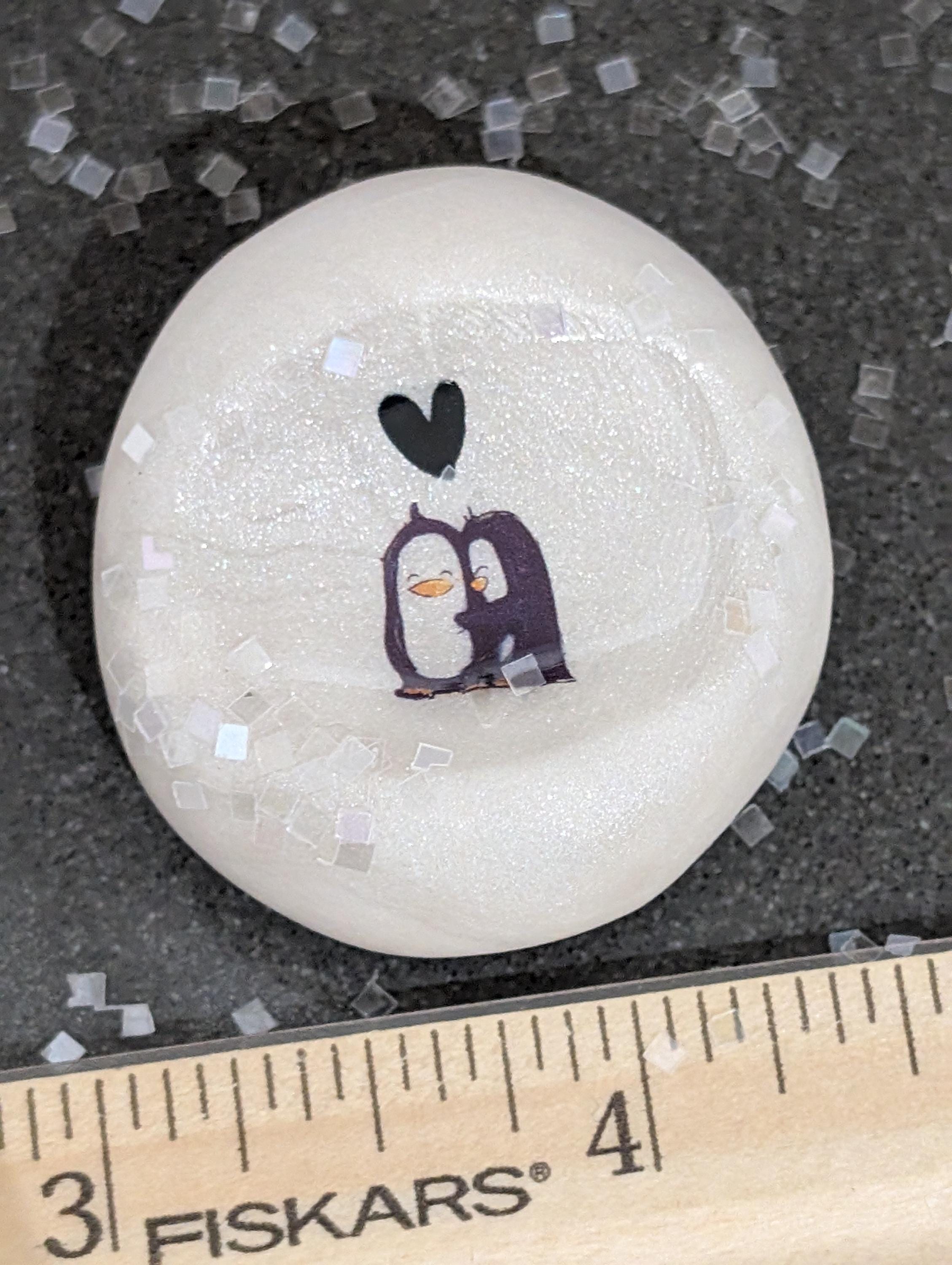 This beautiful pearl-colored nug features an adorable pair of penguins that are clearly in love, with one of them displaying a delightful shyness. Above their charming little heads, a sweet and symbolic heart floats gently, radiating warmth and affection. This design is inspired by the enchanting love story showcased in the beloved Pringle and Finn children’s book series, capturing the essence of enduring love. Celebrating the unique love shared between penguins, this piece serves as a reminder of the beauty of companionship. Its right-hand orientation adds a thoughtful touch, and it is lovingly coated with resin for durability and elegance.