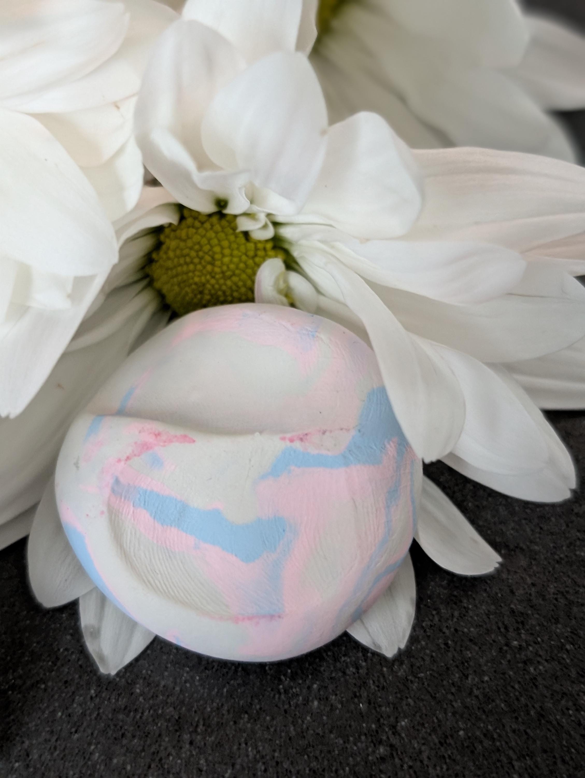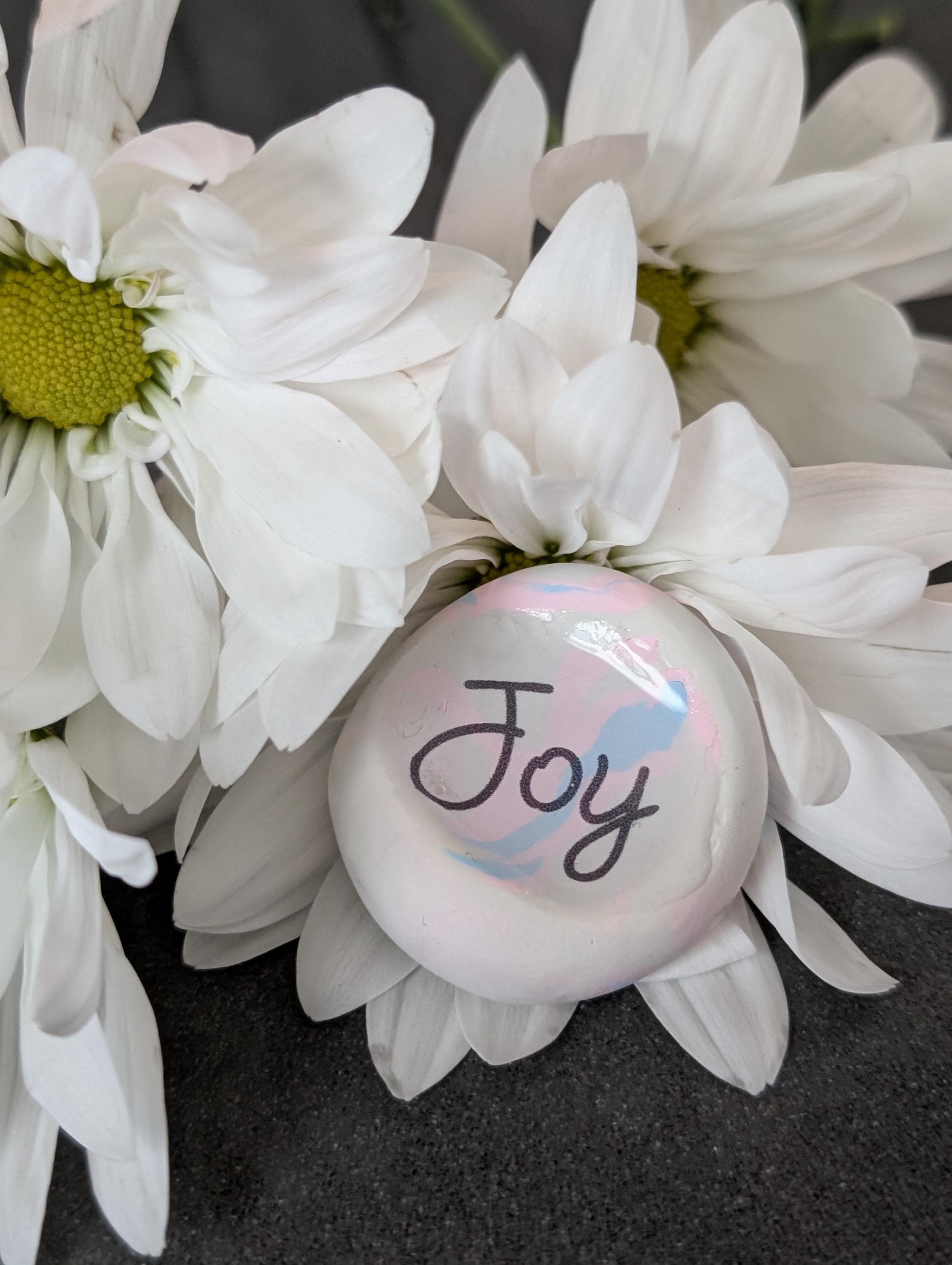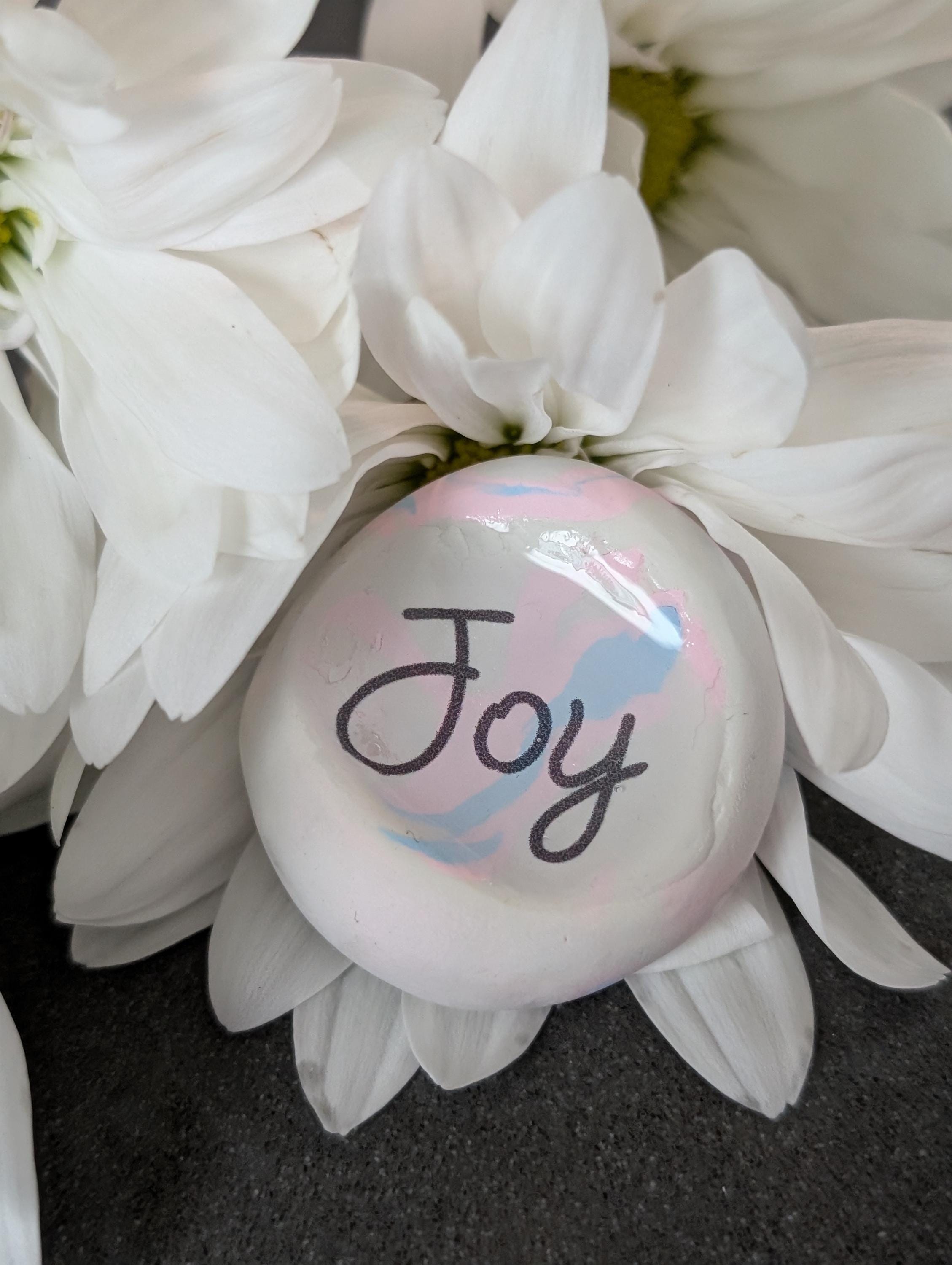 This nug, right-hand oriented and coated with resin, not only showcases the vibrant colors of the trans flag but also boldly highlights the word "joy." Trans joy is a profound celebration of identity and authenticity that inspires us all. It serves as a reminder that embracing one's true self is an act of courage that can illuminate the path for others. In witnessing the resilience and exuberance of the trans community, we are encouraged to reflect on our own journeys toward self-acceptance. The lessons shared through their experiences resonate deeply, teaching us the value of living authentically and spreading joy in our everyday lives. This nug serves as a thoughtful transitional object—a tangible representation of this important narrative that can accompany you on your pathway to stillness via meditation.