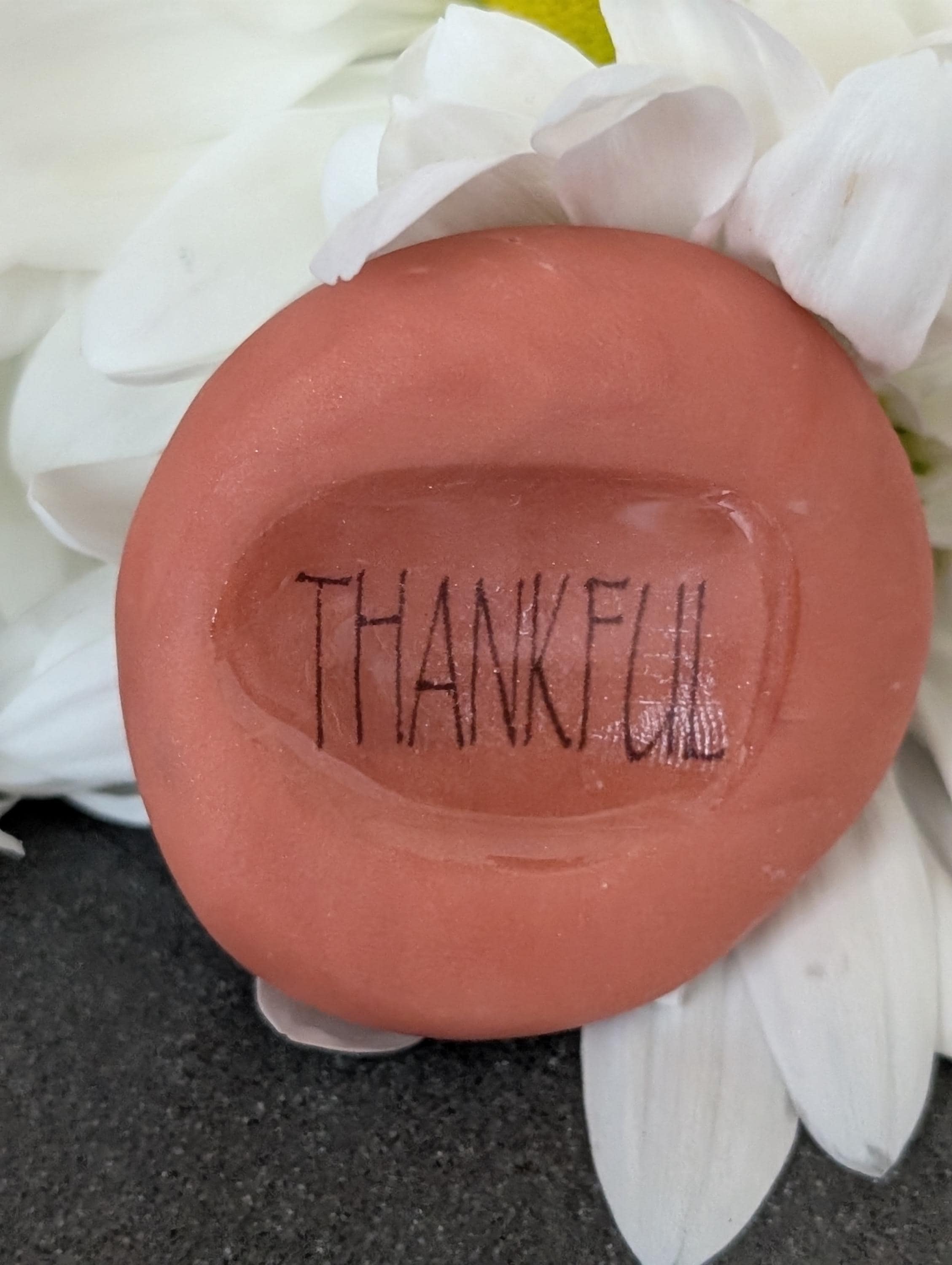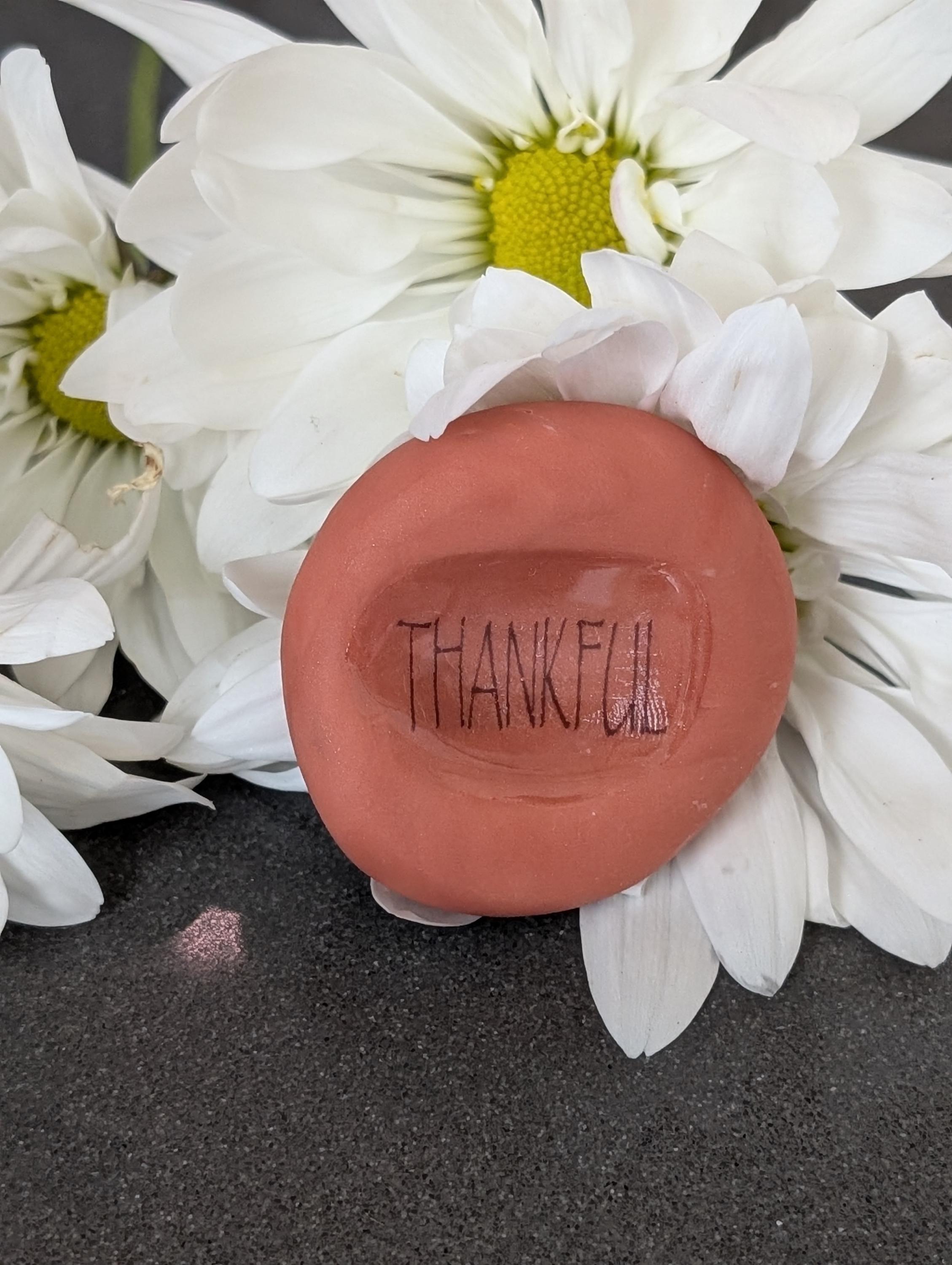 Imagine a beautifully crafted cinnamon-colored nug that prominently features the heartfelt word “thankful.” This piece is designed with a thoughtful left-hand orientation, making it a unique and intentional object. The nug is organically shaped, harmonizing with the natural world, and is elegantly coated in resin to enhance its durability and visual appeal. It serves as a gentle reminder to cultivate gratitude in our daily lives or as a perfect gift for someone special, letting them know just how deeply you appreciate their presence. This mindful nug is more than just an object; it's a symbol of appreciation and thankfulness, encouraging deeper connections and positive intentions..