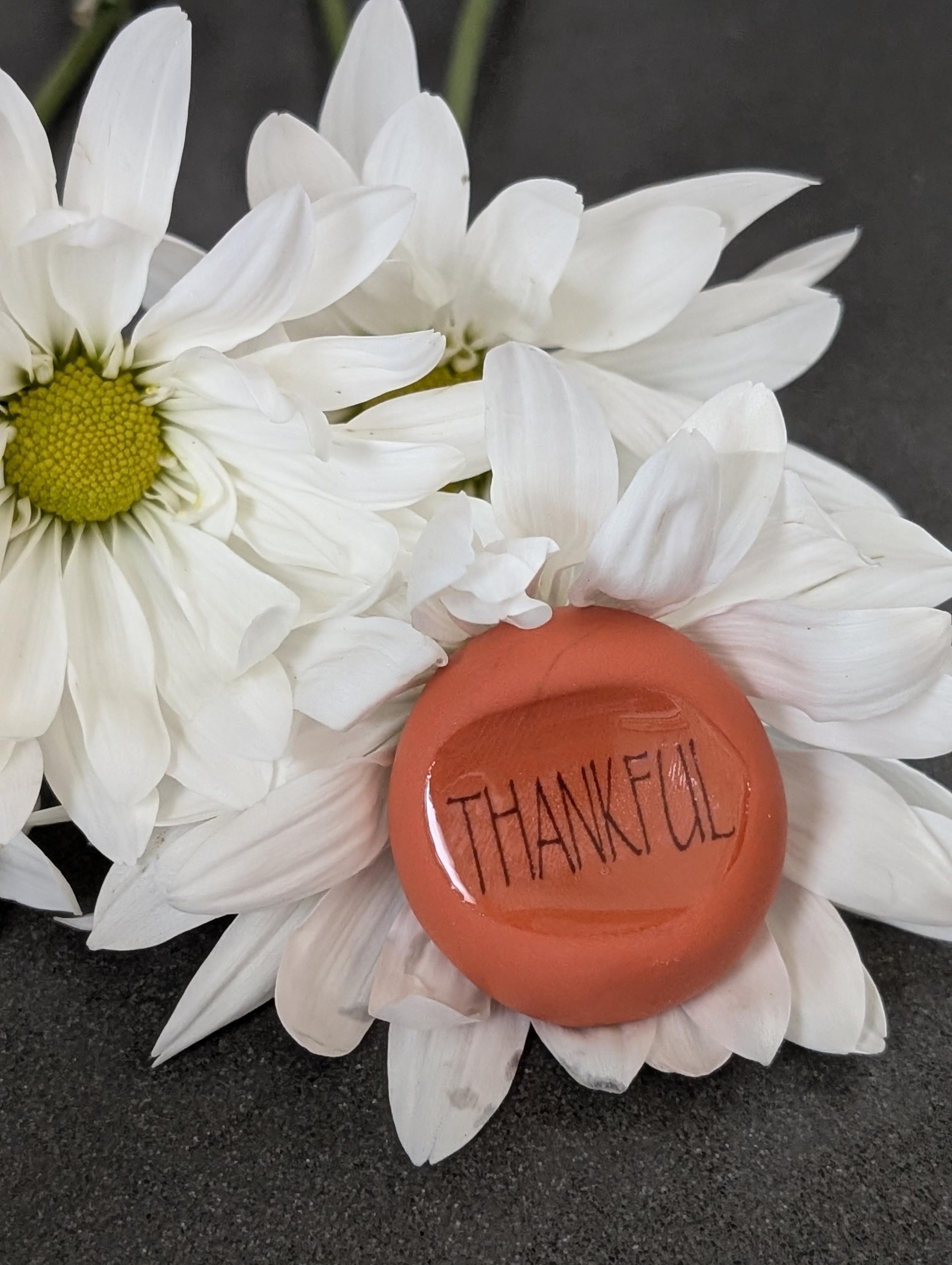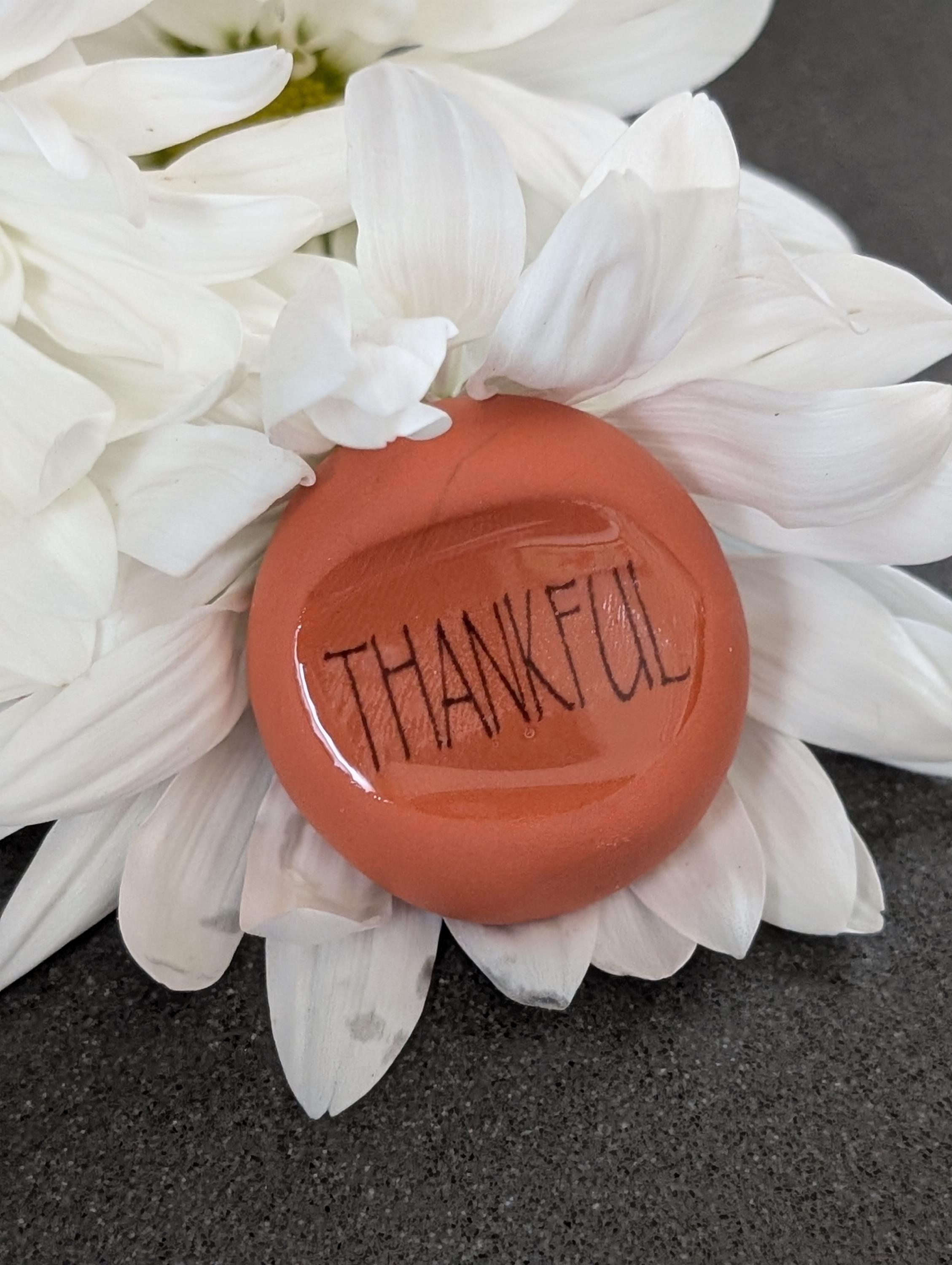 The pumpkin-colored nug subtly features the uplifting word “thankful,” beautifully placed in a right-hand orientation that enhances its charm. Crafted with a smooth resin glaze, this transitional object serves as a gentle reminder to cultivate gratitude and mindfulness in our daily lives. It encourages us to pause and reflect, embracing a deeper sense of appreciation for all that we have.