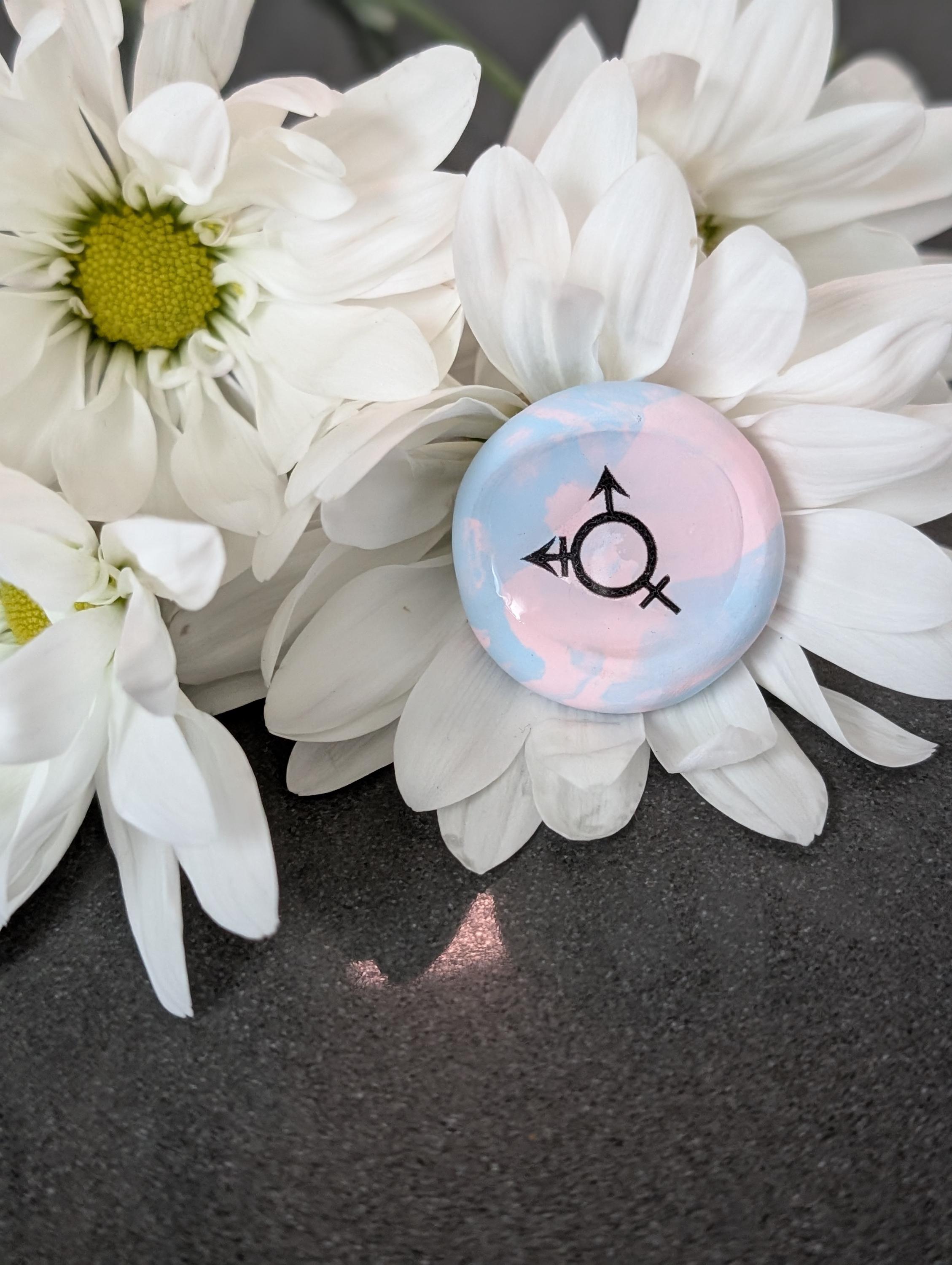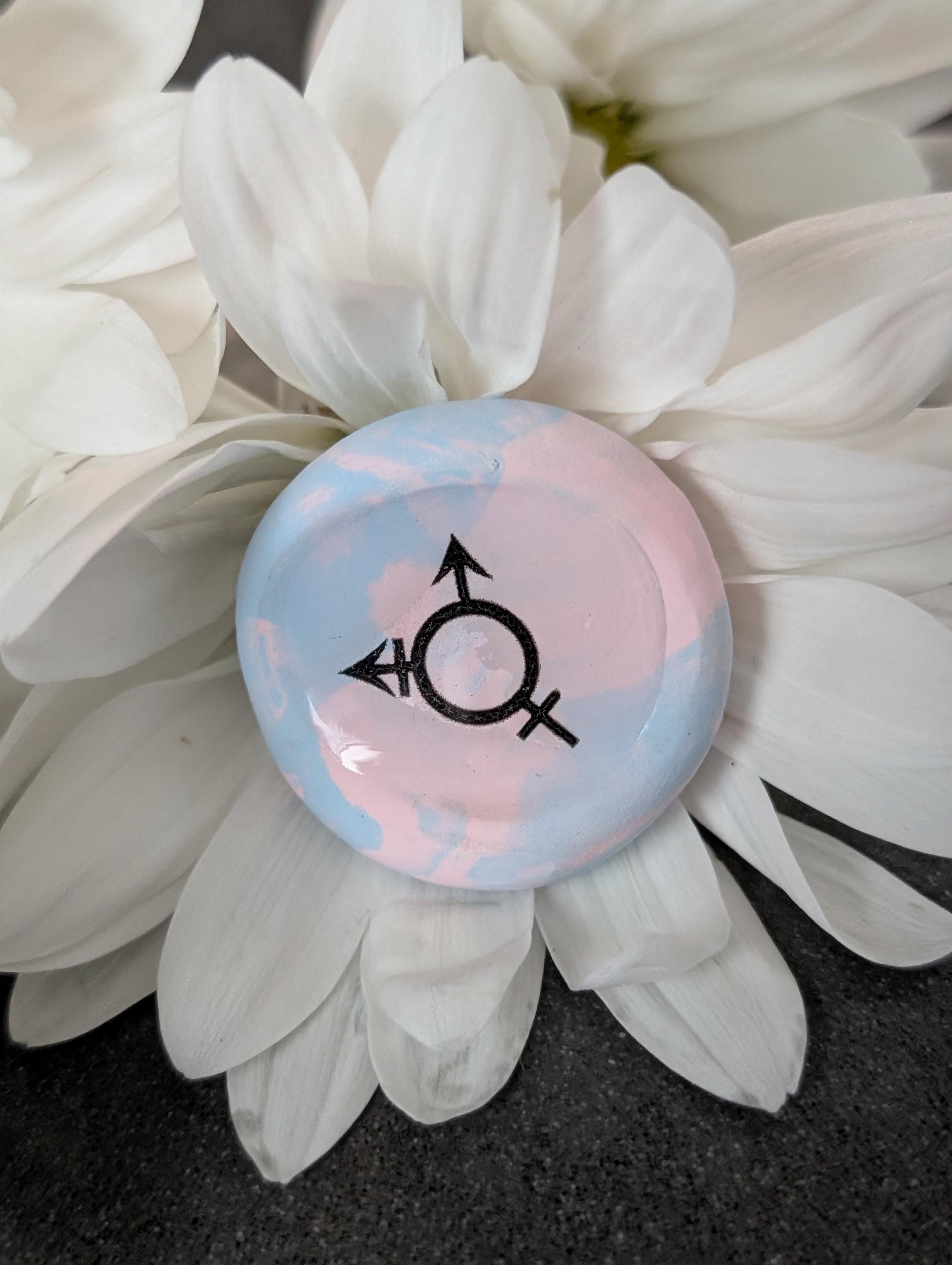 This sweet nug is expertly created in the beautiful colors of the trans flag, thoughtfully featuring the trans symbol to proudly represent and celebrate our rich identity. We want to emphasize that we genuinely cherish the opportunity to collaborate closely with our clients on crafting unique custom nugs, offering an immense and diverse selection of gender symbols to ensure we embrace and honor the individuality of everyone in our beloved community. This beautifully designed piece is intended for right-hand orientation and is lovingly coated with a protective layer of resin for added durability, resilience, and a lustrous shine that captures the essence of our shared journey.