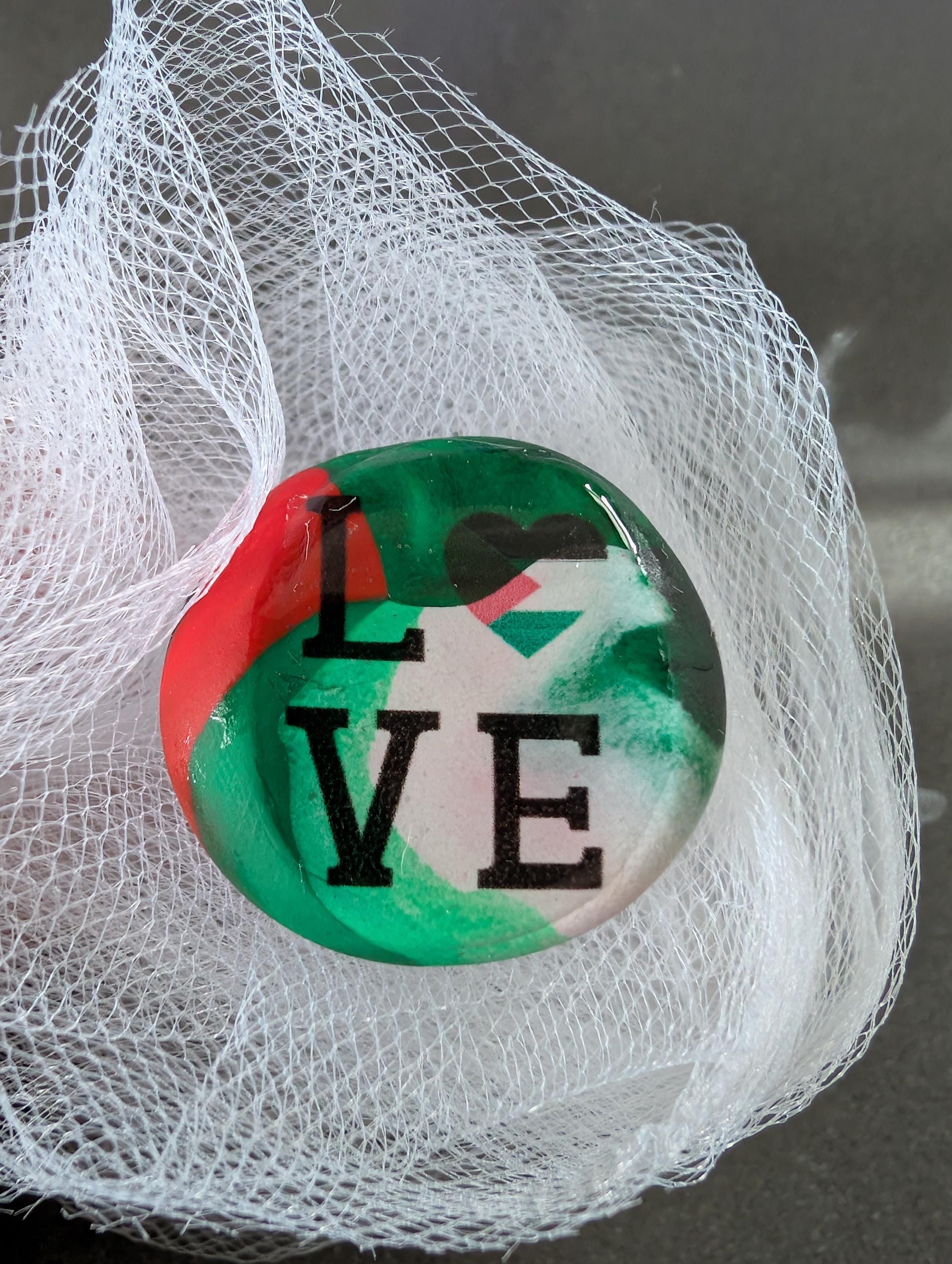 Carry a small symbol of love and solidarity wherever you go. This handmade tricolor worry stone nug is carefully crafted from durable polymer clay and features a heart design inspired by the colors of the Palestinian flag. Each piece is coated in a smooth layer of clear resin for added protection, shine, and long-lasting durability.