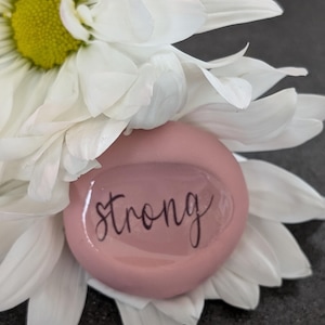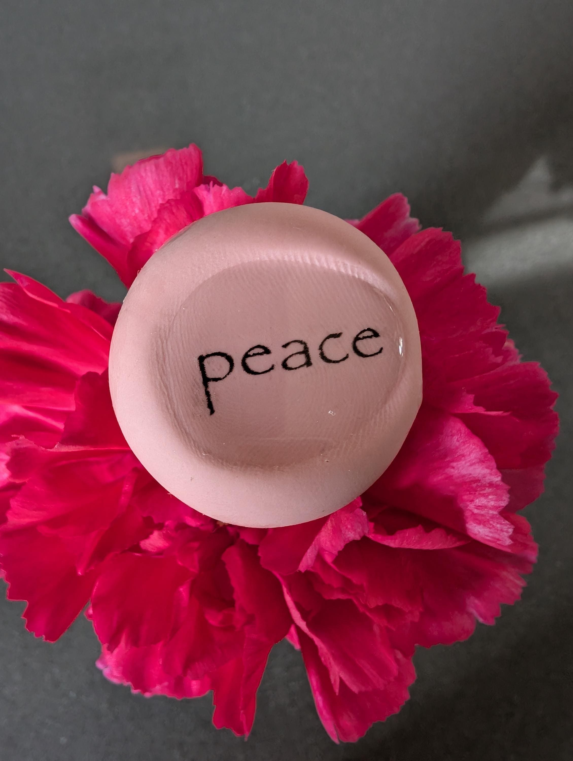This soft pink “Peace” worry stone nug is handmade from durable polymer clay and finished with a smooth, glossy layer of protective resin. The soothing pink tone paired with the word “Peace” creates a simple yet powerful symbol of serenity, compassion, and emotional balance.