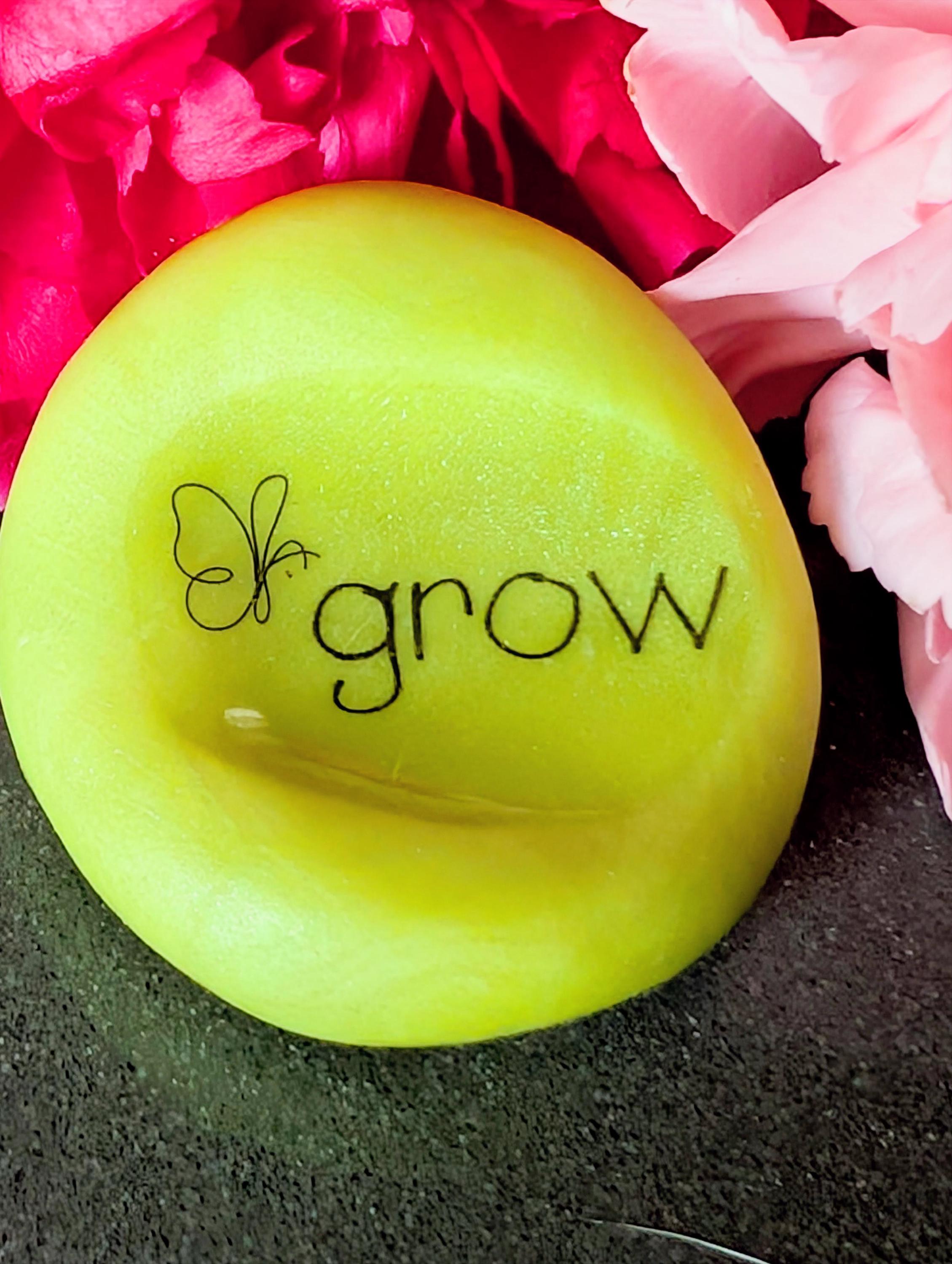 This handcrafted “Grow” Word Nug features the word grow set against a fun apple green clay base, symbolizing renewal, energy, and forward movement. A delicate line-art butterfly accent adds a touch of transformation and lightness, all sealed beneath a glossy resin finish for lasting beauty and protection.
