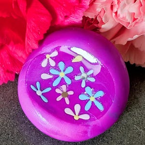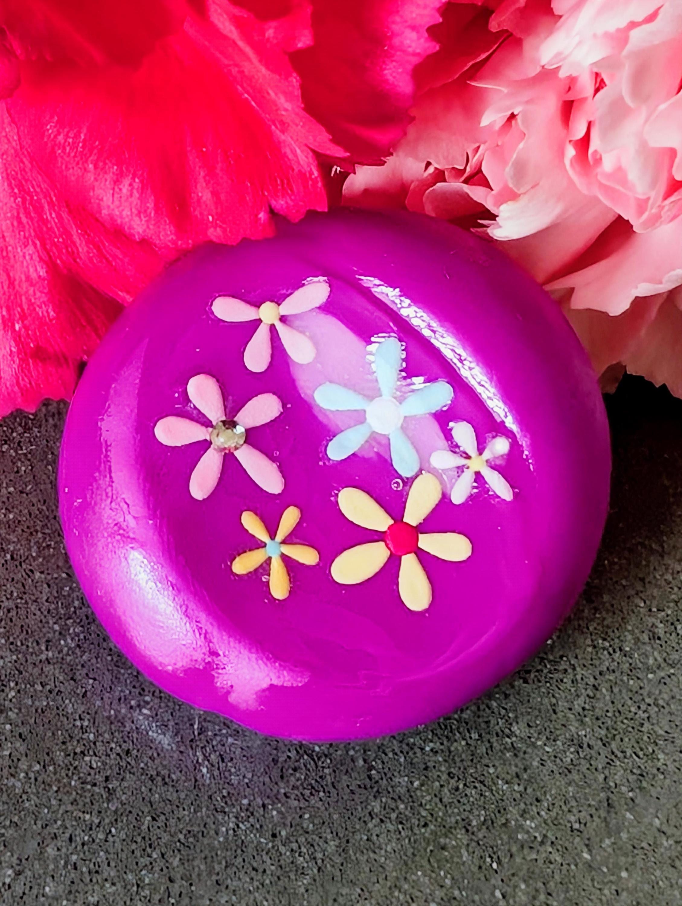 This handcrafted Word Nug features a vibrant plum/violet polymer clay base covered in a variety of fun, modern, feminine flowers—no words needed. Just color, confidence, and fresh spring vibes. Each bloom is sealed beneath a glossy layer of resin, creating a smooth, glass-like finish that enhances the richness of the violet base and protects every delicate detail.