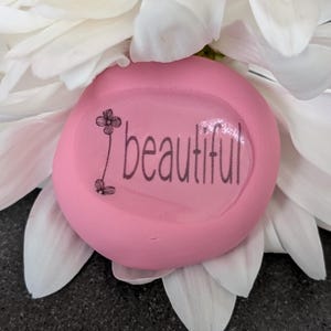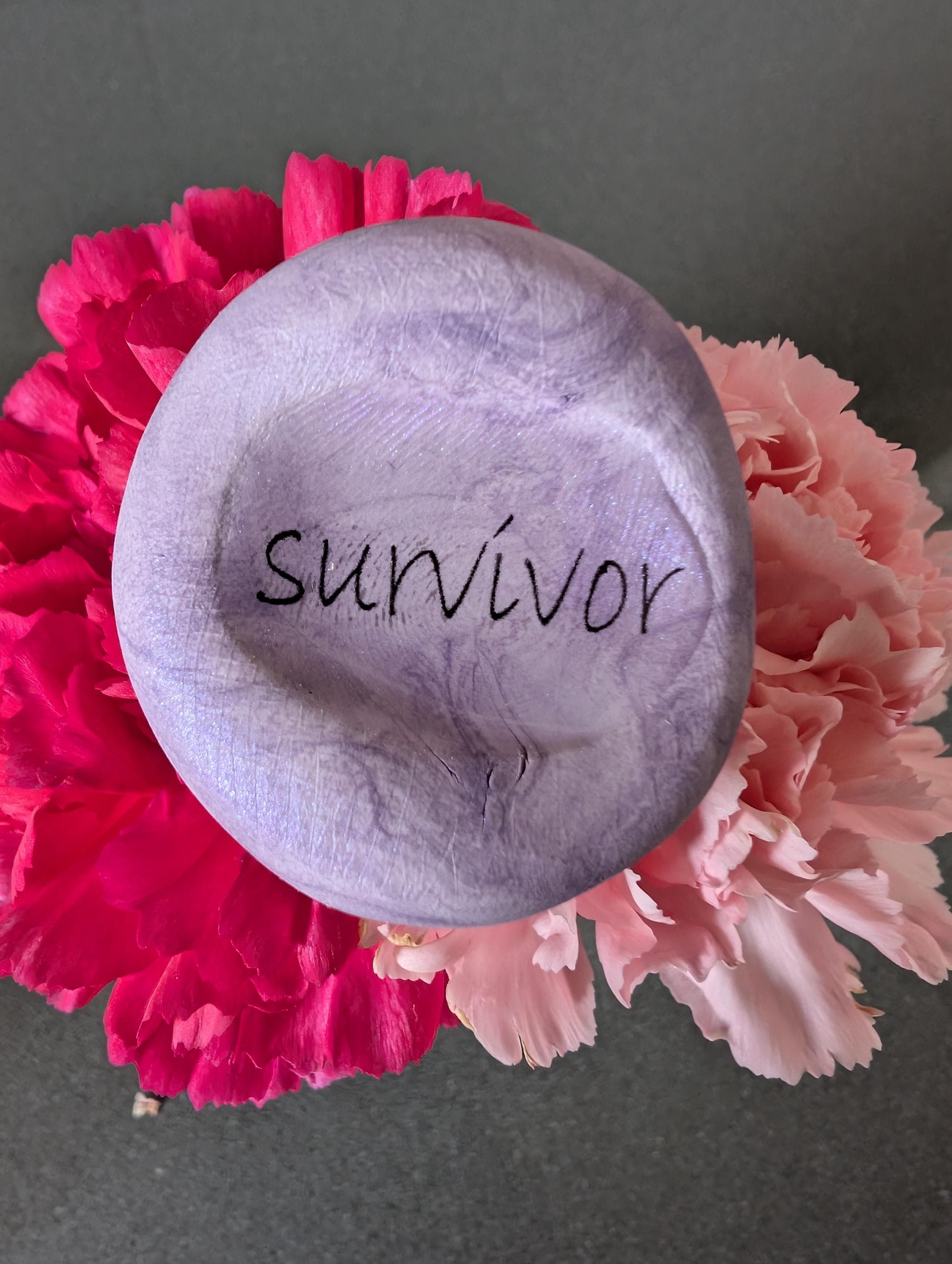 This handcrafted “Survivor” Word Nug features the word survivor set against a luminous pearlescent purple polymer clay base. Sealed beneath a glossy layer of resin, the surface has a smooth, glass-like finish that enhances the gentle shimmer while protecting the design for everyday handling.