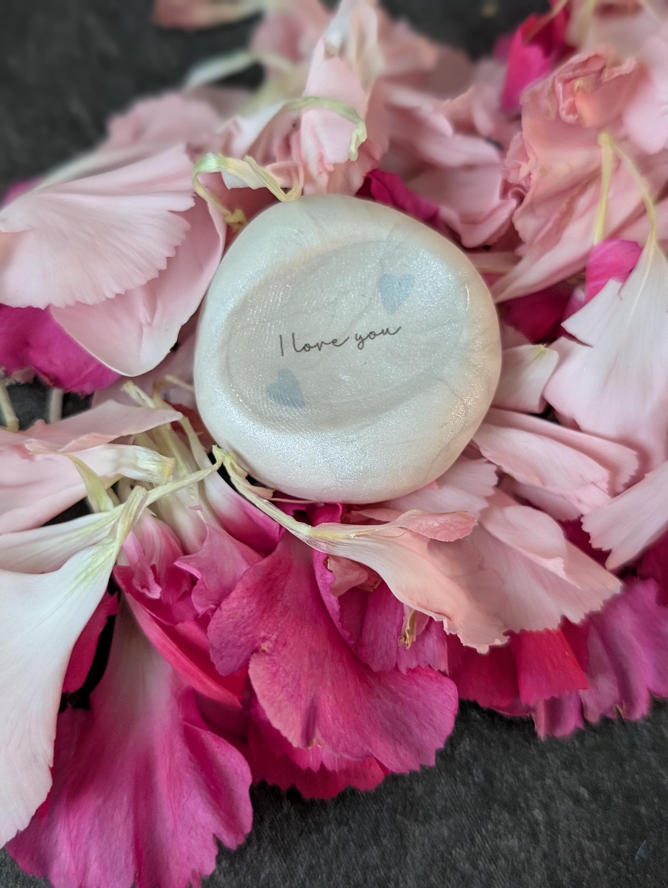 This handcrafted word stone features a luminous pearl base, symbolizing purity and enduring love. Centered on the stone are the words “I love you,” gently framed by two soft blue hearts—one on each side—creating a balanced and tender design. A smooth, glossy coating of clear resin seals the piece, giving it a glass-like shine while protecting it for years to come.