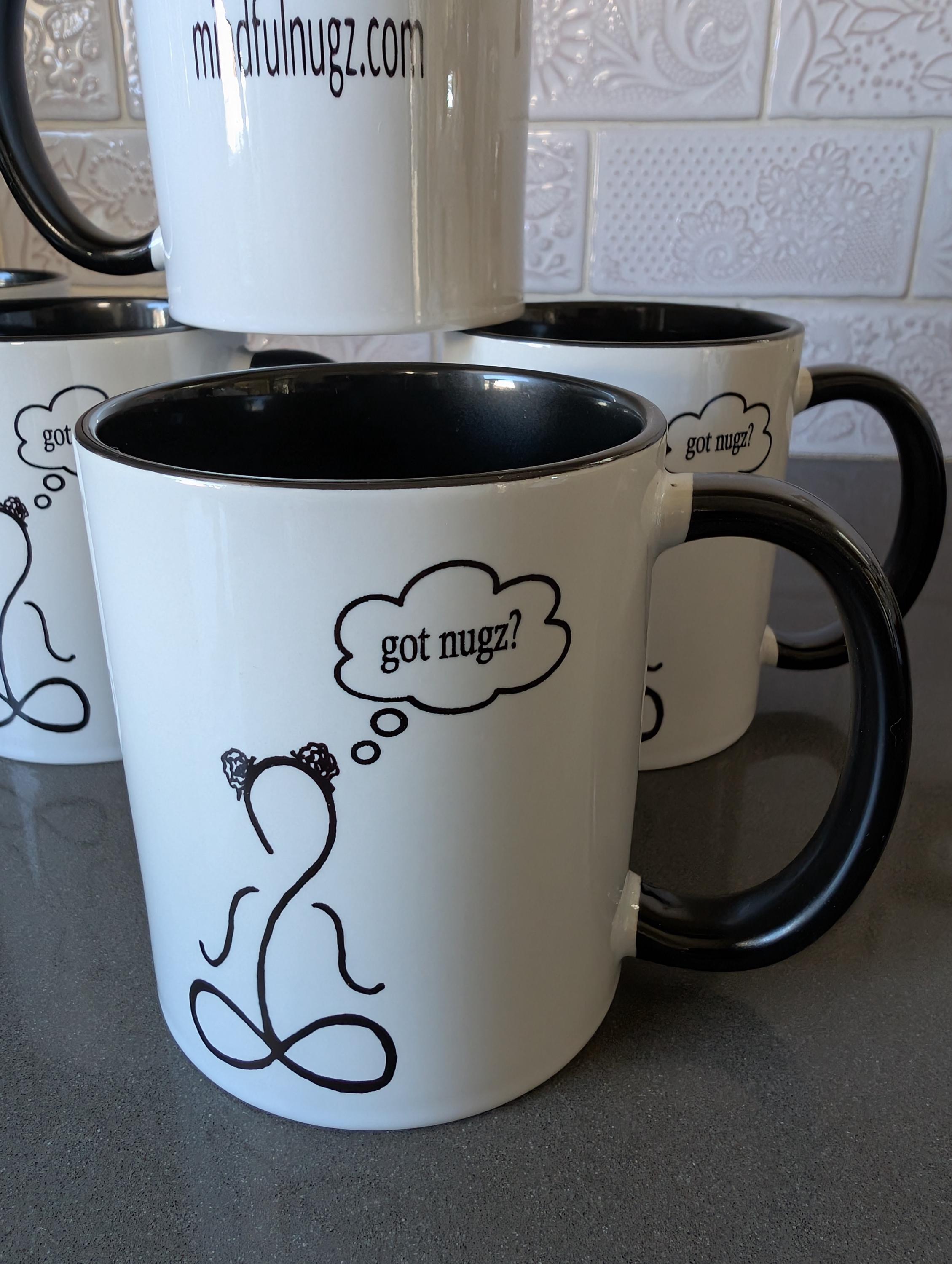 Description: Elevate your daily ritual with this bold and mindful Mugz coffee mug. Designed with a crisp white exterior, glossy black interior, and sleek black handle, this mug creates the perfect contrast to make the “got nugz?” thought bubble and MindfulNugz logo truly pop.
