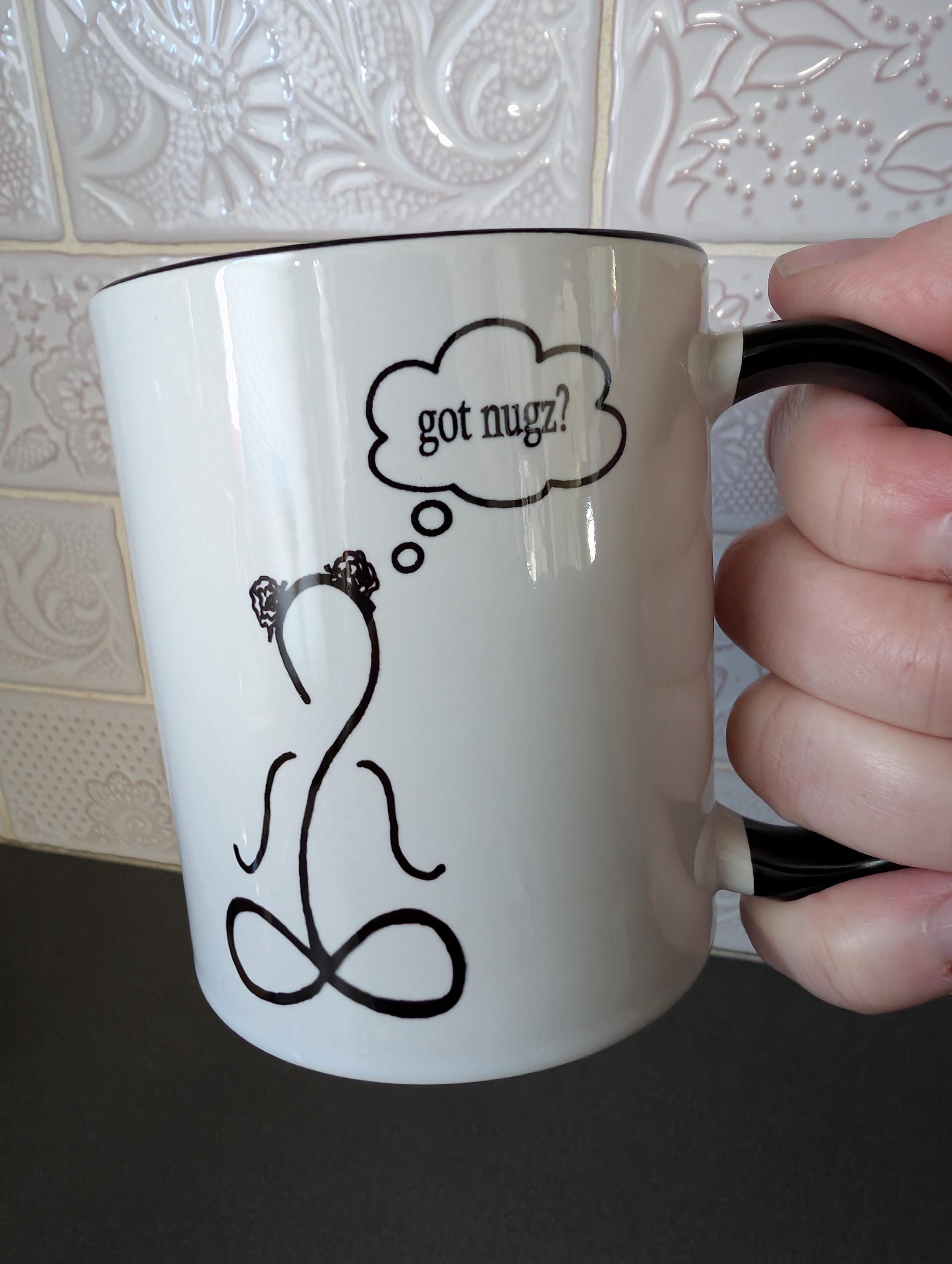 Features: • Premium ceramic Mugz coffee mug • White exterior with glossy black interior • Black handle for a bold, modern look • “got nugz?” thought bubble design (front) • MindfulNugz logo detail • mindfulnugz.com printed on reverse • High-contrast design for maximum visual impact • Dishwasher and microwave safe